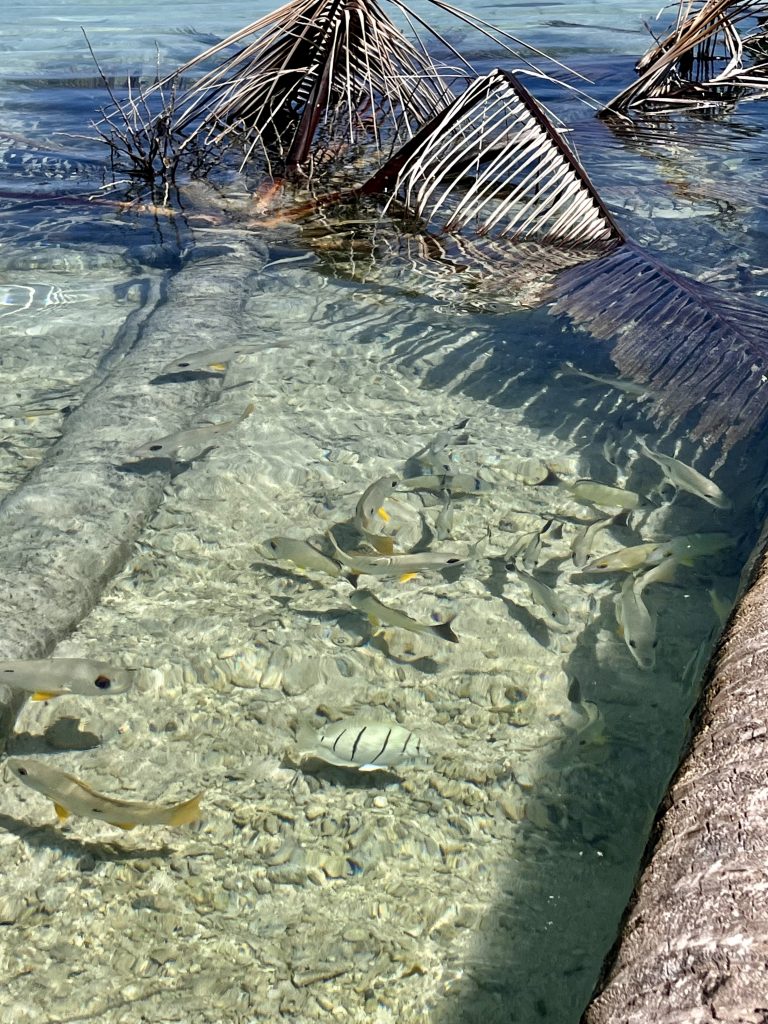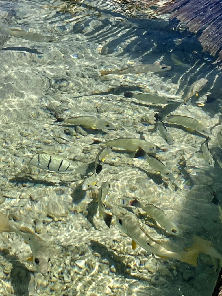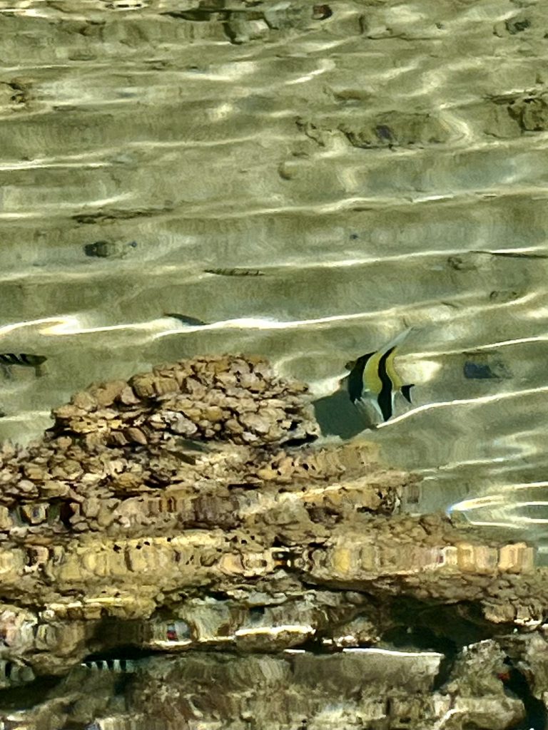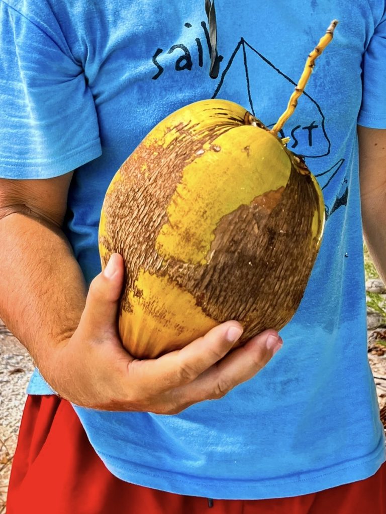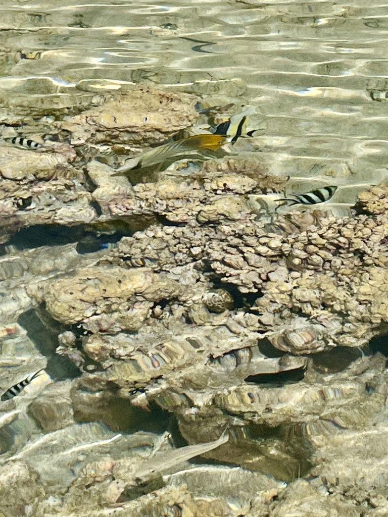 Und tatsächlich gibt’s nen Haiangriff! Nicht auf uns, auf die von uns aufgeschreckten Fische. Puhhh, ob einer der beiden Angreifer erfolgreich war? Kann ich nicht sagen. Es gab auf jeden Fall ein ordentliches Gespritze. Normalerweise jagen Haie am späten Nachmittag, wenn die Sonne untergeht. Und in den frühen Morgenstunden. Sie brauchen kein Tageslicht, sie sehen ohnehin sehr schlecht. Sie erspüren und riechen ihre Beute. Da haben sie wohl eben eine Ausnahme gemacht. Darauf erstmal nen Schluck aus der Kokosnuss 🥥 🌴.