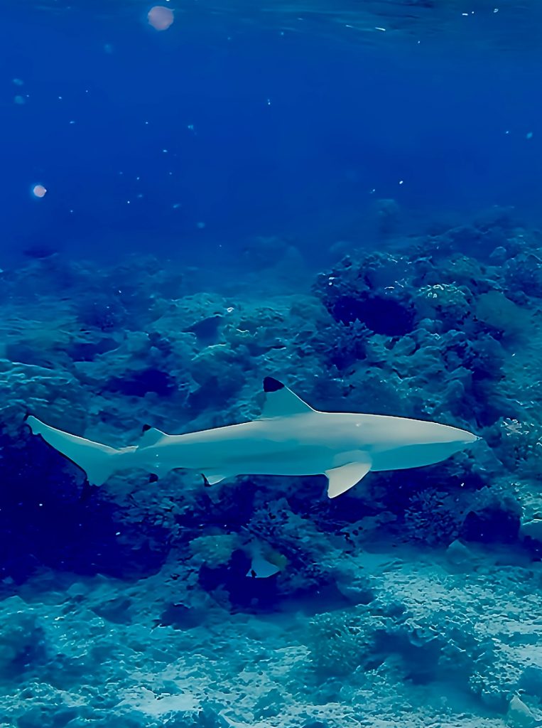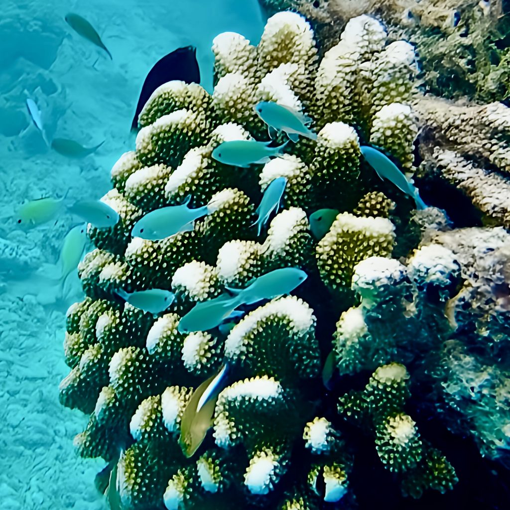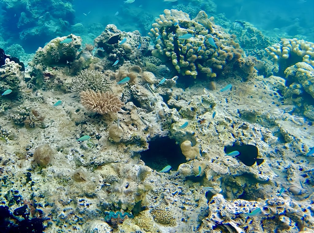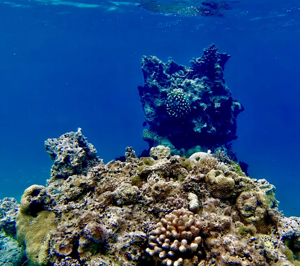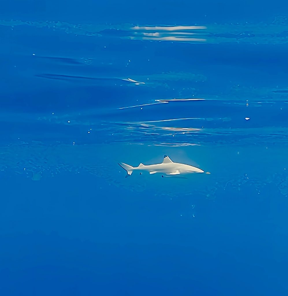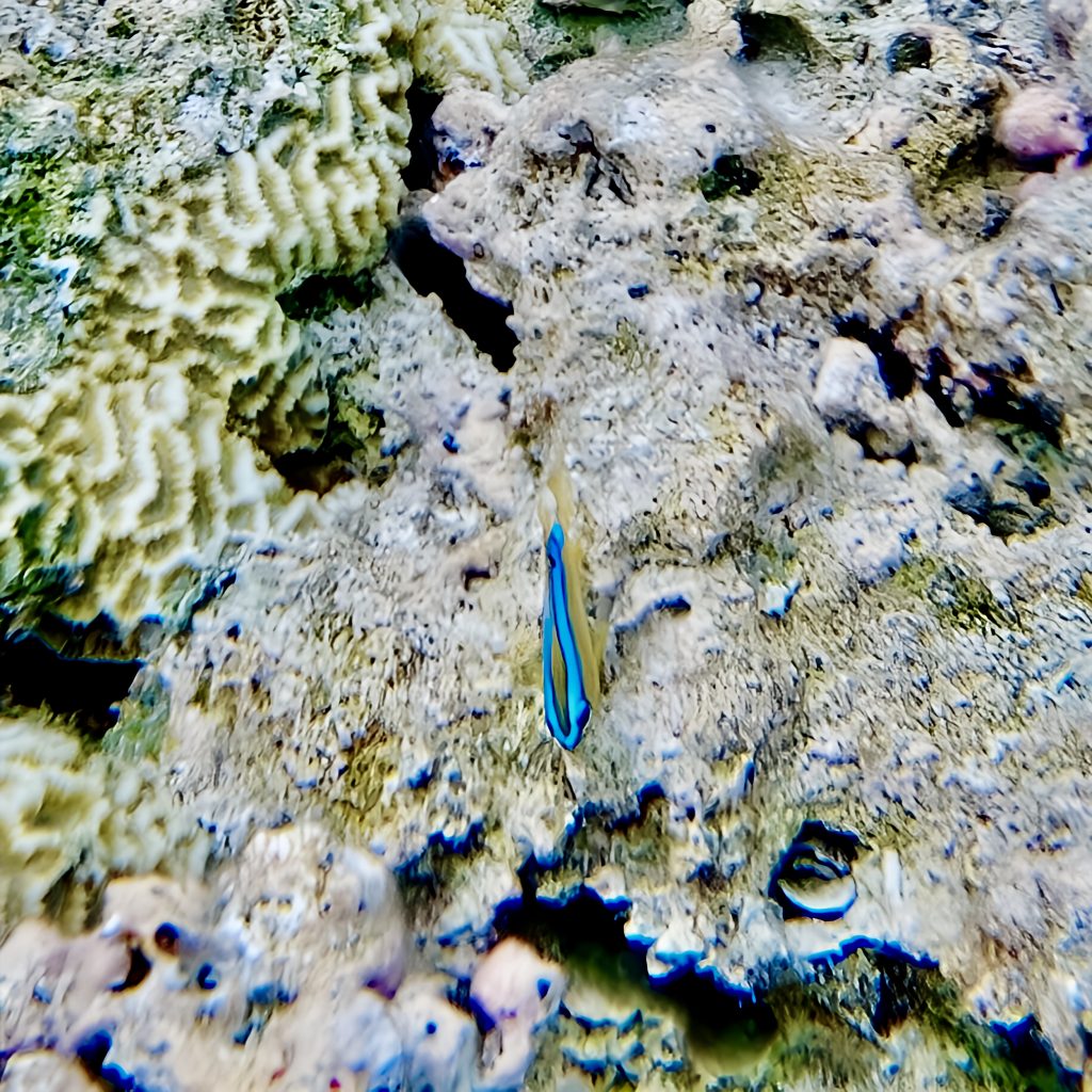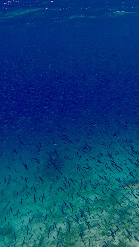 Klaus hat den Korallenkopf erreicht und schnorchelt munter hin und her. Der Fischtross mit Hai hat ihn wirklich bis dorthin eng begleitet, verteilt sich aber jetzt. Lustig!