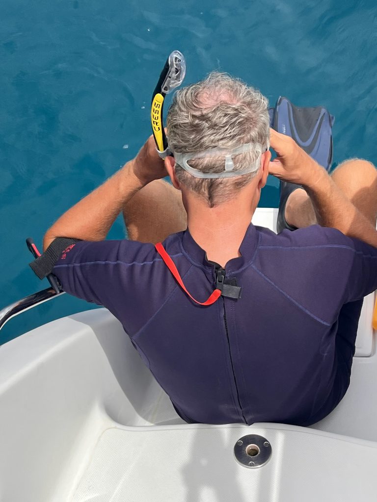 Und jaaa, das Wetter ist besser, wir können alle Fenster öffnen und durchatmen. Solange bis Regen und Wind am frühen Mittag mit voller Kraft zurückkehren werden. Aber dazwischen nutzt Klaus die Zeit und will zum nächstgelegenen Bommie schnorcheln gehen. Er nimmt sogar die alte GoPro mit.