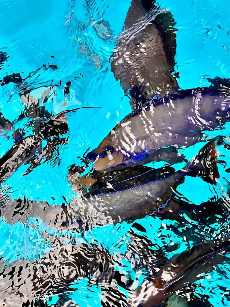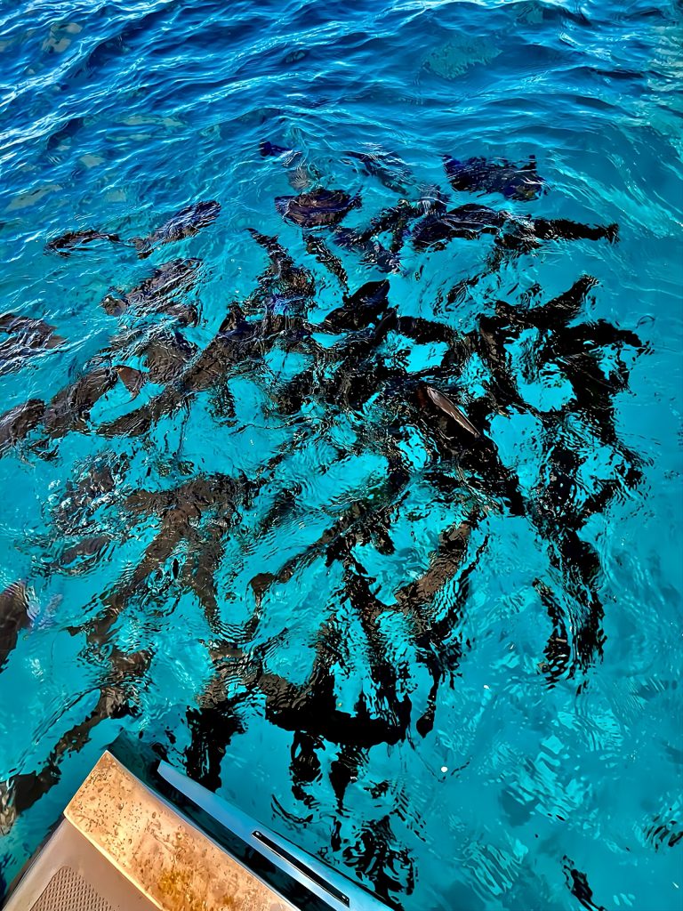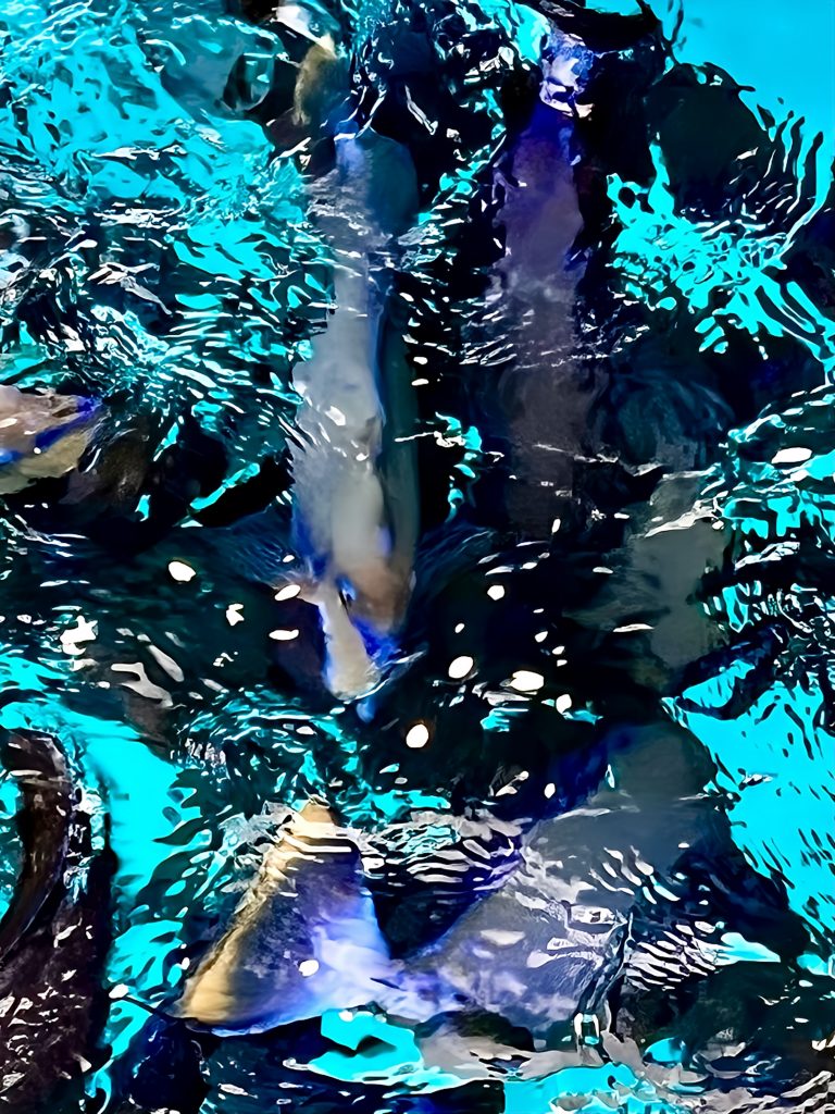 Aber zuerst werden mal unsere „Bootsfische“ gefüttert. Ich werfe nur ein paar Haferflocken ins Wasser und ein Sturm bricht los.