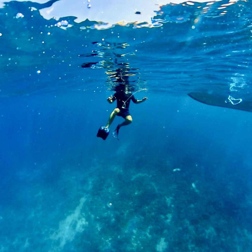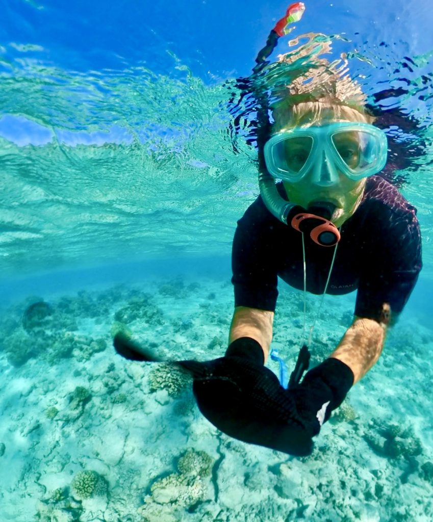Aber Klaus ist angespannt und macht schier ein Fass auf. Ich muss mich mit einer Leine um den Bauch ans Dinghy festbinden, sonst lässt er mich nicht ins Wasser. Häää 😳? Ich wollte die Leine lieber in die Hand nehmen und flexibel bleiben… Dann fährt er sehr stark in die Mitte des Passes und auch nicht sooo weit raus, wie ich es wollte. Er sorgt sich zu sehr wegen der Brandung und will dort nicht hineingeraten und sterben… Oh, oh, oh…, daran denke ich überhaupt nicht! 🙄 Eben, meint Klaus. 🫣 Am Ende binde ich mich murrend an, und wir platschen ins Wasser.