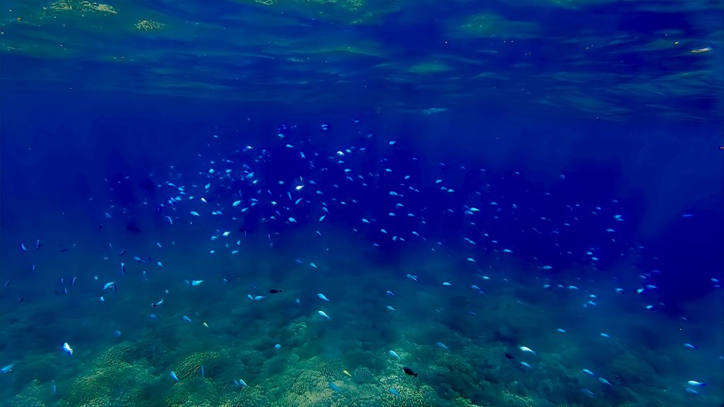 Keine Fischschwärme, keine wartenden Haie, nothing. Nur ein Trupp kleiner, blauer Fischchen ist gerade noch so zu erhaschen. Und dafür jetzt die ganze Aufregung???