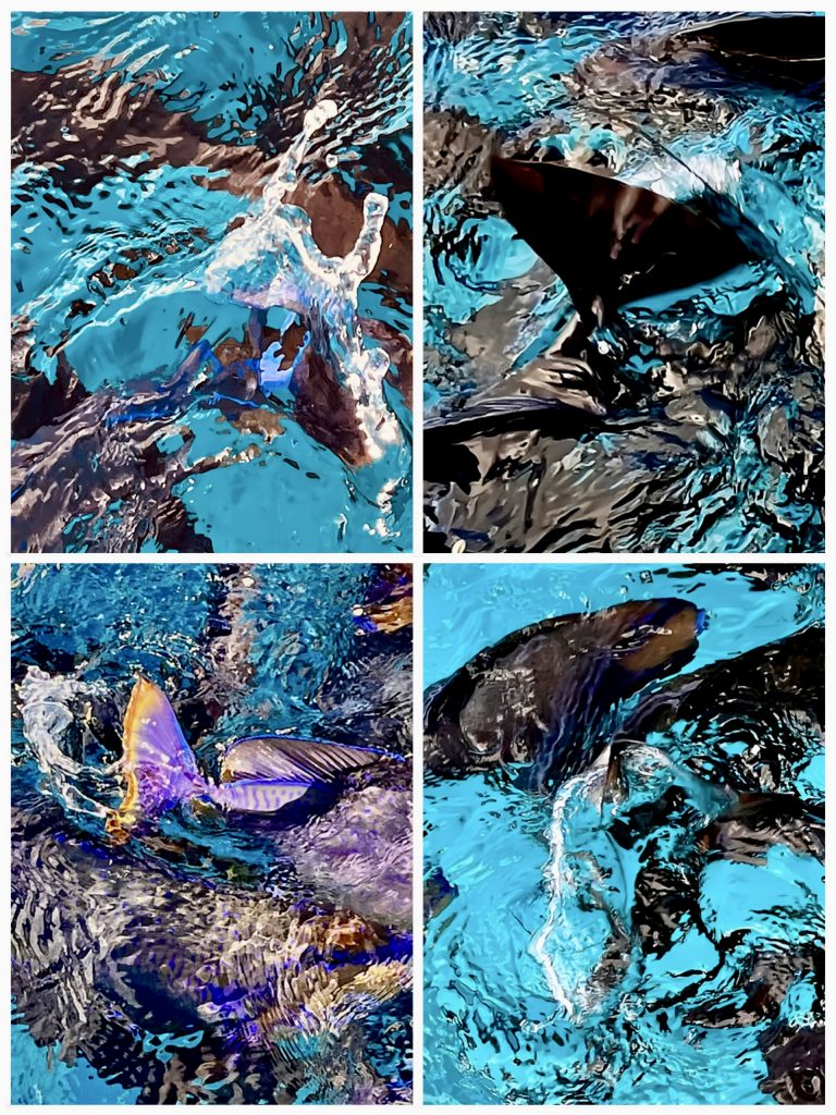 Das müssten Masken-Nasendoktoren sein. Witzig sind ihre langen Schwanzflossenfäden. Das sind die ausgezogenen Strahlen der Schwanzflosse, so ist’s recht. Wofür die wieder gut sind? Ich weiß es nicht. Jedenfalls muss ich beim Füttern der Fische an Alva denken, wie sie vor 2 1/2 Jahren auf Phuket bei uns an Bord war und wir gemeinsam ebenfalls Fische fütterten.