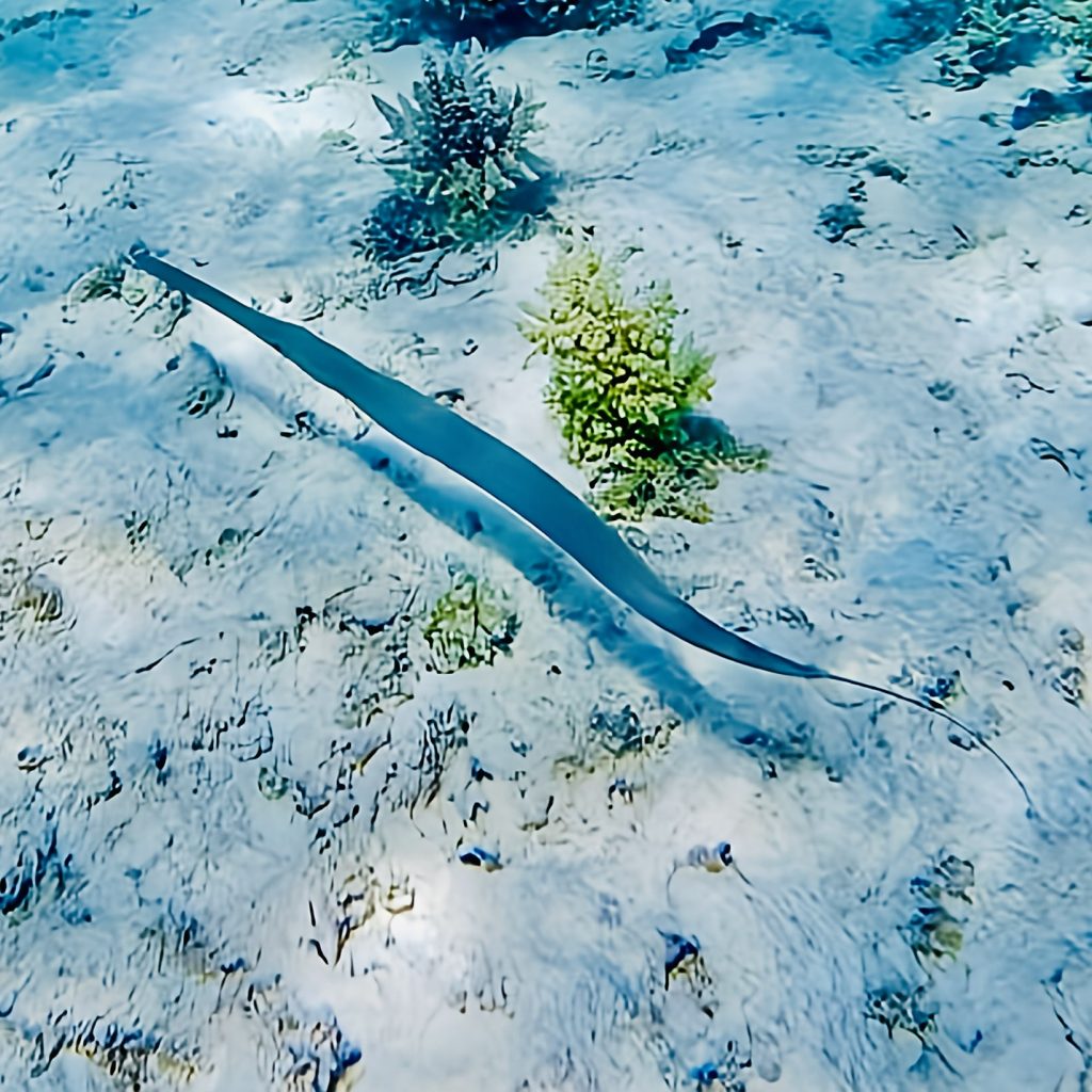 Diese hübsche Trompete kommt ihm auch noch vor die Linse. Aber warte nur, meine „Stunde“ kommt noch. Wir schwimmen zurück und nehmen wieder die kleine Abkürzung zum Dinghy übers Riff. Und genau wie gestern begegnet uns ein „Trompetenrudel“. 🎺🎺🎺
