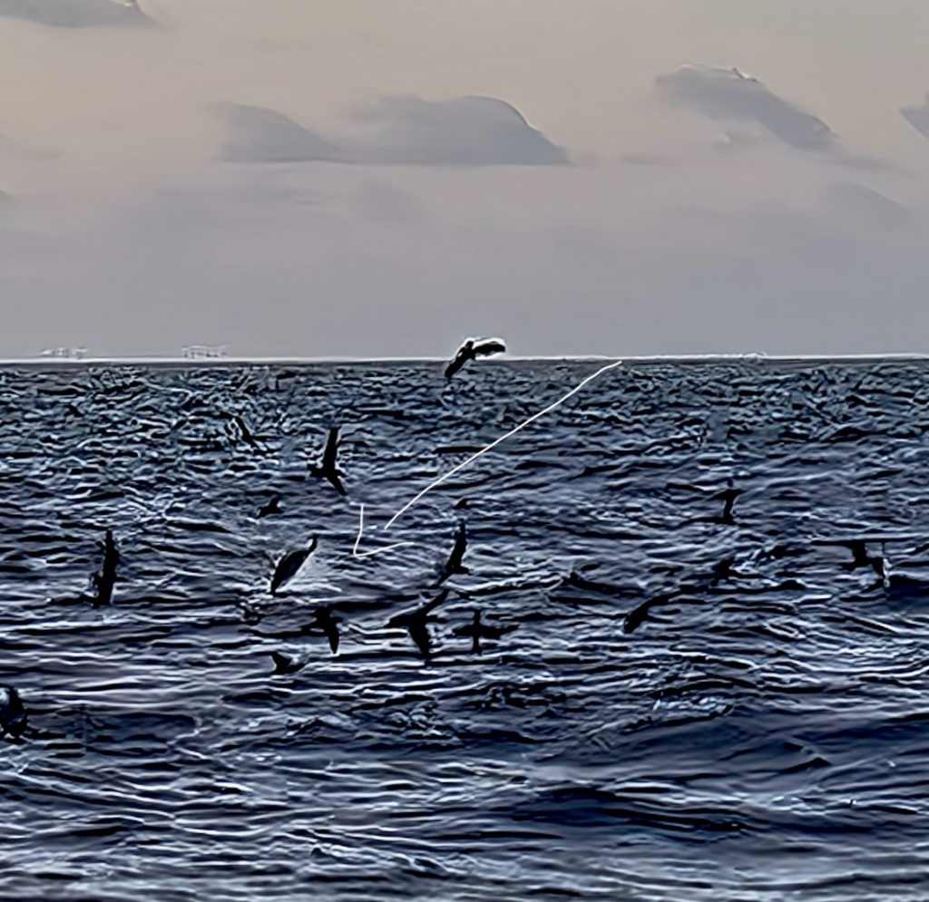 Unterwegs werden wir noch Zeugen einer wilden Hochseejagd. Thunfische gehen bei einsetzender Dämmerung auf Fischfang, schießen manchmal sogar aus dem Wasser und locken damit eine Schar Noddis und anderer Seevögel an.