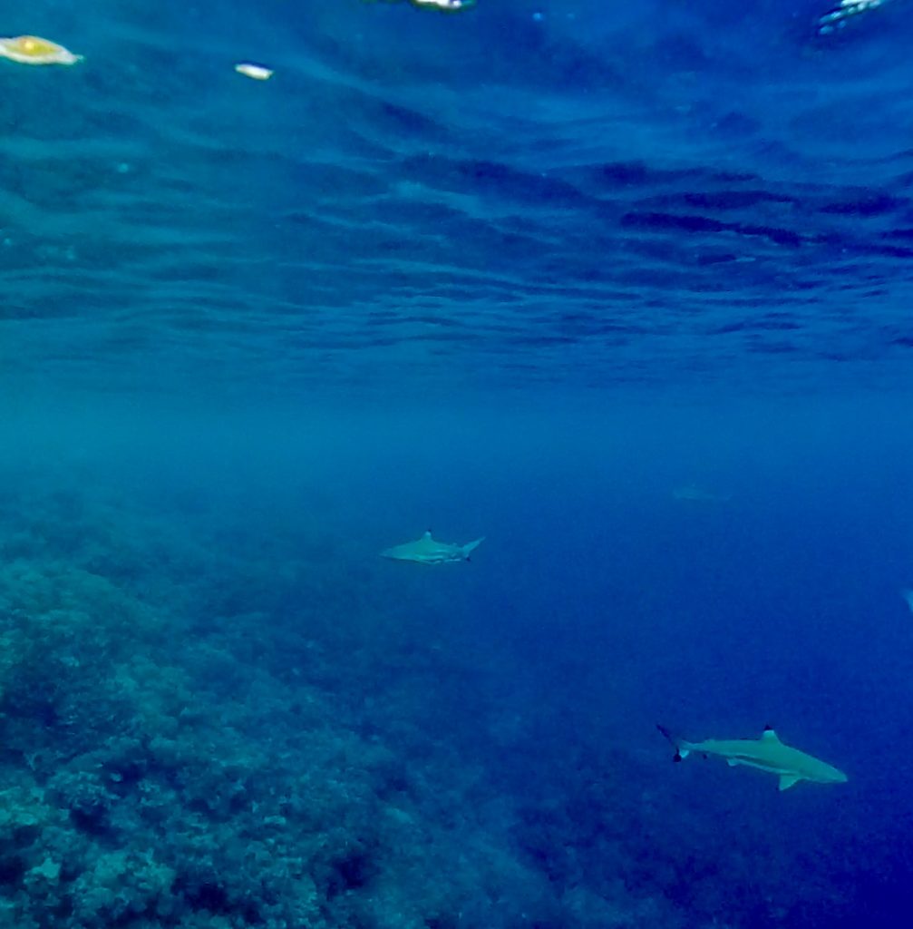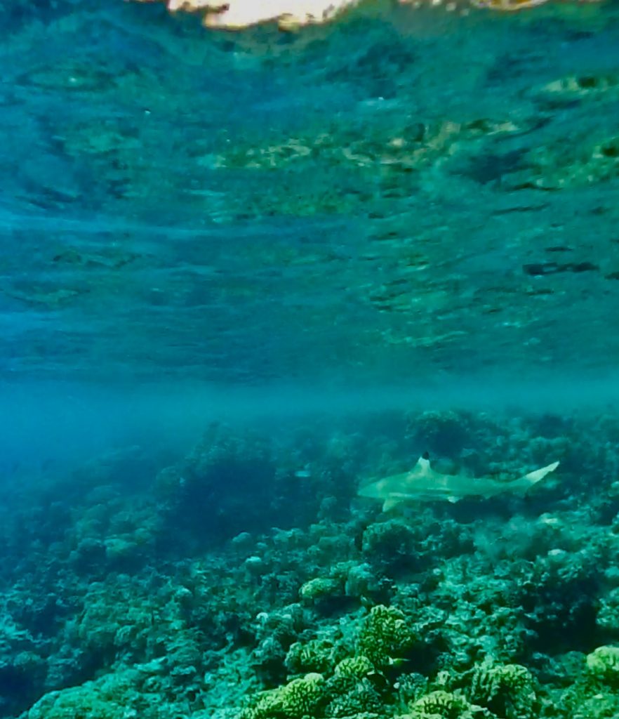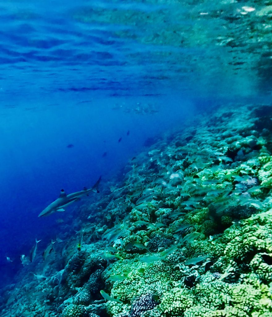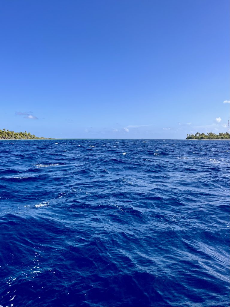 Es ist jetzt gerade viertel nach neun und nach einer kleinen Adrenalinpause geht’s auch gleich weiter. Wir wollen unbedingt noch den Pass beschnorcheln. Gerade passt das Wetter, und die nächste Flut ins Atoll hinein ist am Nachmittag. Also ab ins nächste Abenteuer, zur Wall of Sharks, zitter, schlotter, schwitz… Wir schmeißen uns ins Dinghy und düsen zurück zum Südpass. Unterwegs rufen wir noch einem Tauchlehrer zu, ob das jetzt auch die richtige Zeit ist. Er meint so in ner Stunde… Huch, wir fahren in den Pass hinein und machen uns erstmal an einer Boje fest und warten ab. Dann macht sich Klaus fertig, gleitet ins Wasser und testet die Lage. Nee, alles klar, passt. Es herrscht gerade gar keine Strömung und wenn, dann eher hineinfließend. Alles rodscha in Kambodscha, auch ich lasse mich mit einer Rolle rückwärts ins Wasser plumpsen. Gesichert am Dinghy schnorcheln wir nun ganz gemächlich durch den Pass. Zur Mitte des Passes hin wird es dunkelblau. Da können wir nicht wirklich was erkennen.