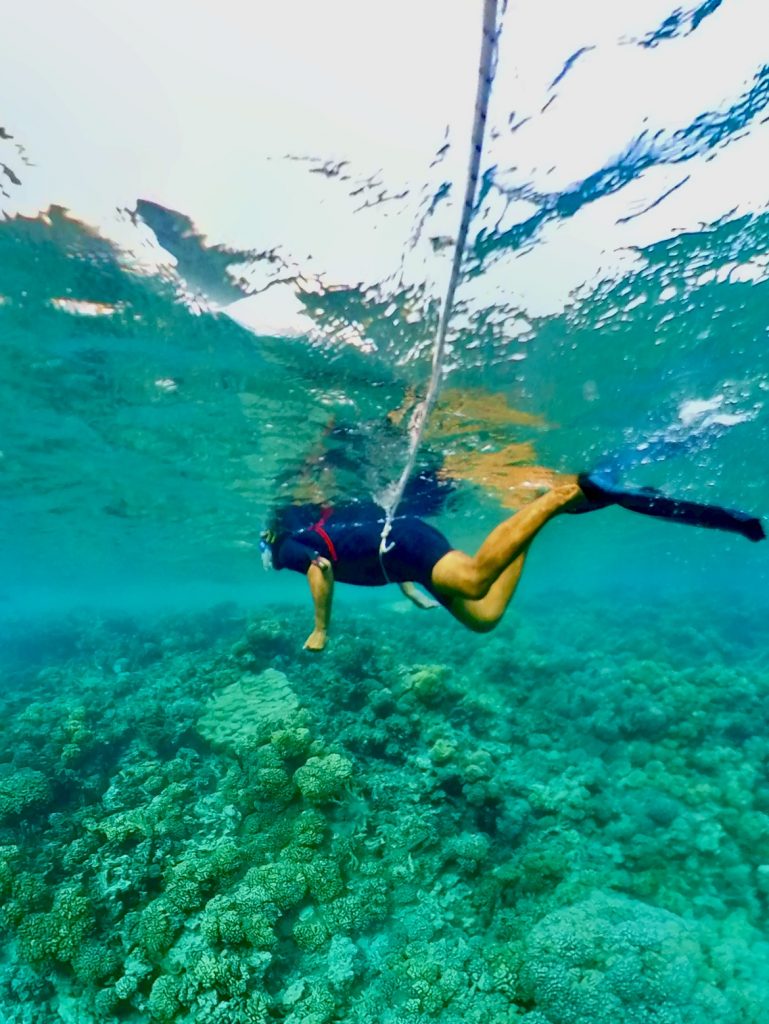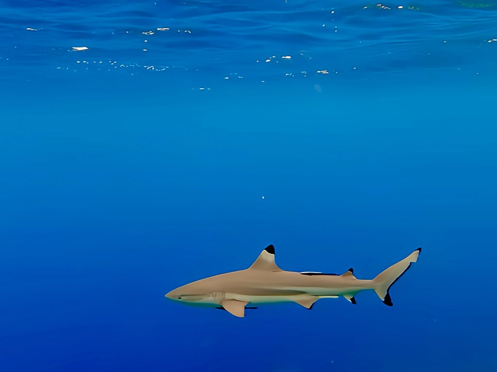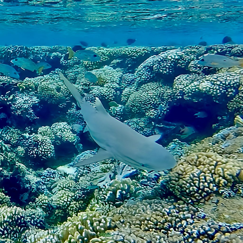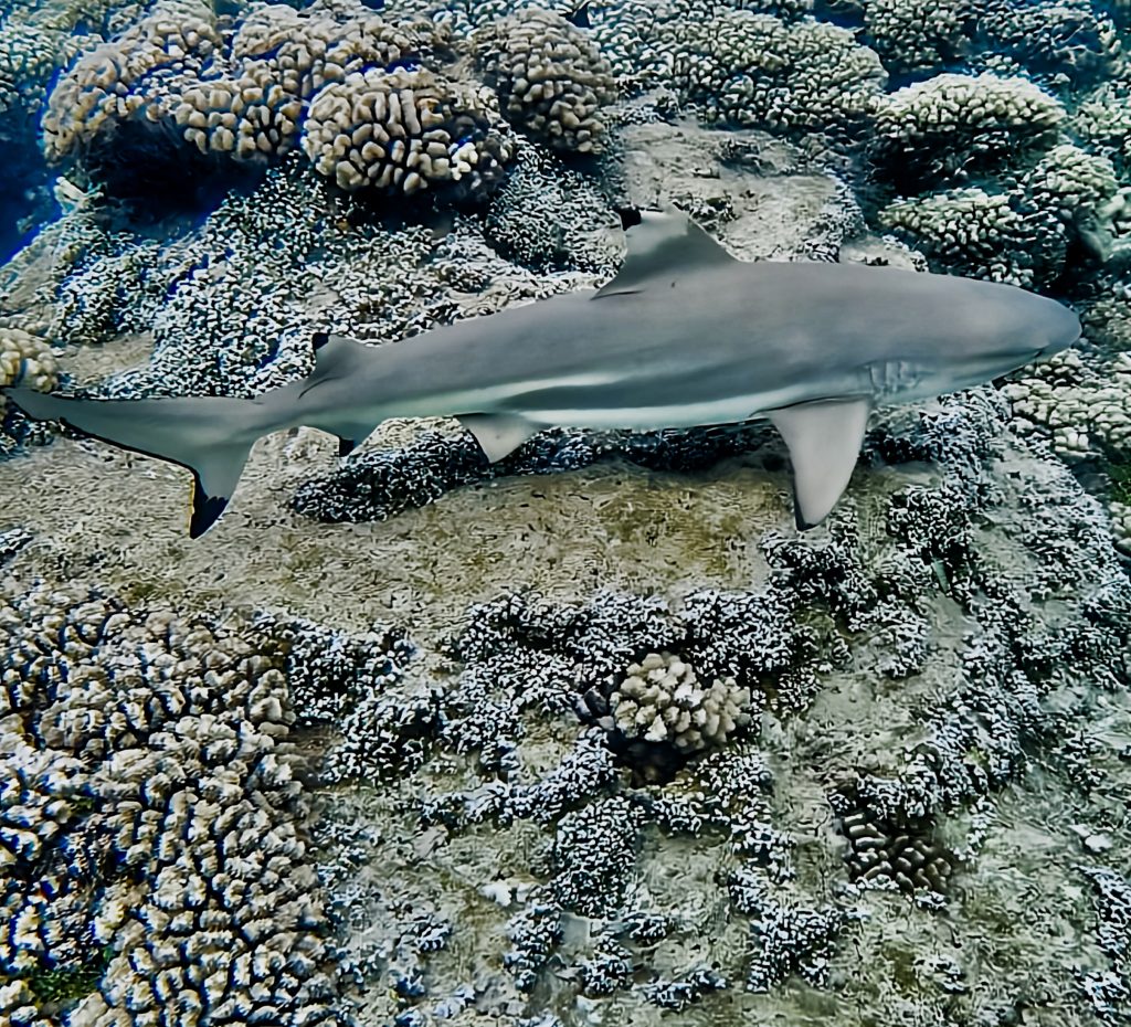 Es ist jetzt gerade viertel nach neun und nach einer kleinen Adrenalinpause geht’s auch gleich weiter. Wir wollen unbedingt noch den Pass beschnorcheln. Gerade passt das Wetter, und die nächste Flut ins Atoll hinein ist am Nachmittag. Also ab ins nächste Abenteuer, zur Wall of Sharks, zitter, schlotter, schwitz… Wir schmeißen uns ins Dinghy und düsen zurück zum Südpass. Unterwegs rufen wir noch einem Tauchlehrer zu, ob das jetzt auch die richtige Zeit ist. Er meint so in ner Stunde… Huch, wir fahren in den Pass hinein und machen uns erstmal an einer Boje fest und warten ab. Dann macht sich Klaus fertig, gleitet ins Wasser und testet die Lage. Nee, alles klar, passt. Es herrscht gerade gar keine Strömung und wenn, dann eher hineinfließend. Alles rodscha in Kambodscha, auch ich lasse mich mit einer Rolle rückwärts ins Wasser plumpsen. Gesichert am Dinghy schnorcheln wir nun ganz gemächlich durch den Pass. Zur Mitte des Passes hin wird es dunkelblau. Da können wir nicht wirklich was erkennen.