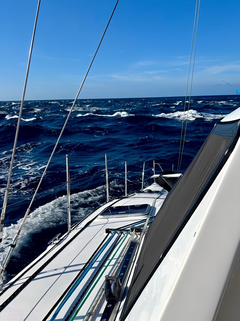 Nun ja, bin ja alte Voltigiererin und fühle mich in meine Jugend zurückversetzt. Stehen auf galoppierendem Pferd, kommt der Sache schon ganz gut nahe. Bloß kommen die Wellen von allen Seiten und klatschen mich total nass. Das war beim Voltigieren nicht so. Ich kann immer schon sehen, welche Welle mich gleich erwischen wird. Bis auf die, die unterm Boot durchgehen und durchs Trampolin wieder hochspritzen und mich dann von hinten erwischen. 🌊 Also ich bin zum zweiten Mal an diesem Tag klitsche klatsche nass und kann erst nach vollständiger Passage wieder den Ausguck verlassen, nach hinten wackeln und mich erneut trockenlegen und das Salz aus meinen Augenbrauen streichen. 🤓