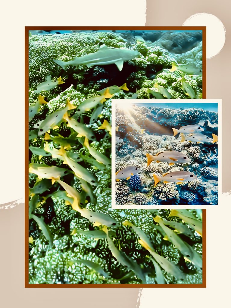 Ganze Trupps von Meerbarben sind unterwegs. Wenn man genau bei dem nächsten Video hinschaut, kann man bei einigen wenigen Barben, weiße zappelige Fühler erkennen, die nach vorne gestreckt werden. Was ist das? Das sind die am Kinn sitzenden Barteln. Diese Barteln werden beim Schwimmen eng an den Körper gelegt und zur Nahrungssuche nach vorne unten gestreckt. Es sind mit besonders vielen Geschmacksknospen besetzte Tastorgane, um im Sand und zwischen den Korallen versteckte Würmer, Weichtiere, Krebse und Fische aufzuspüren.
