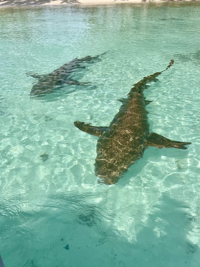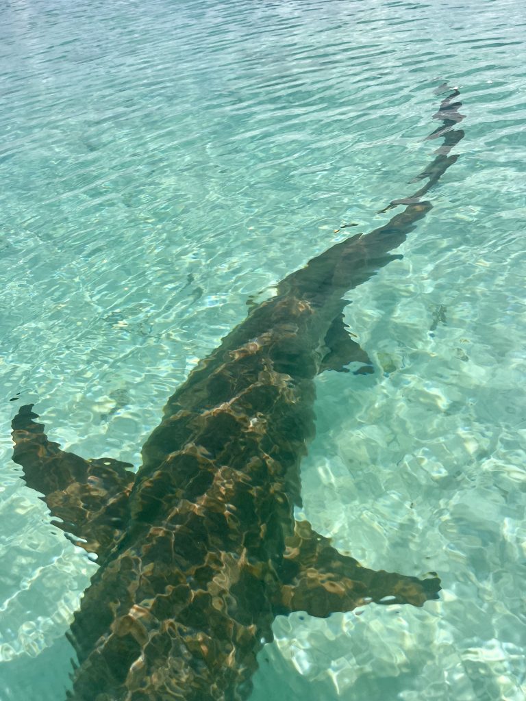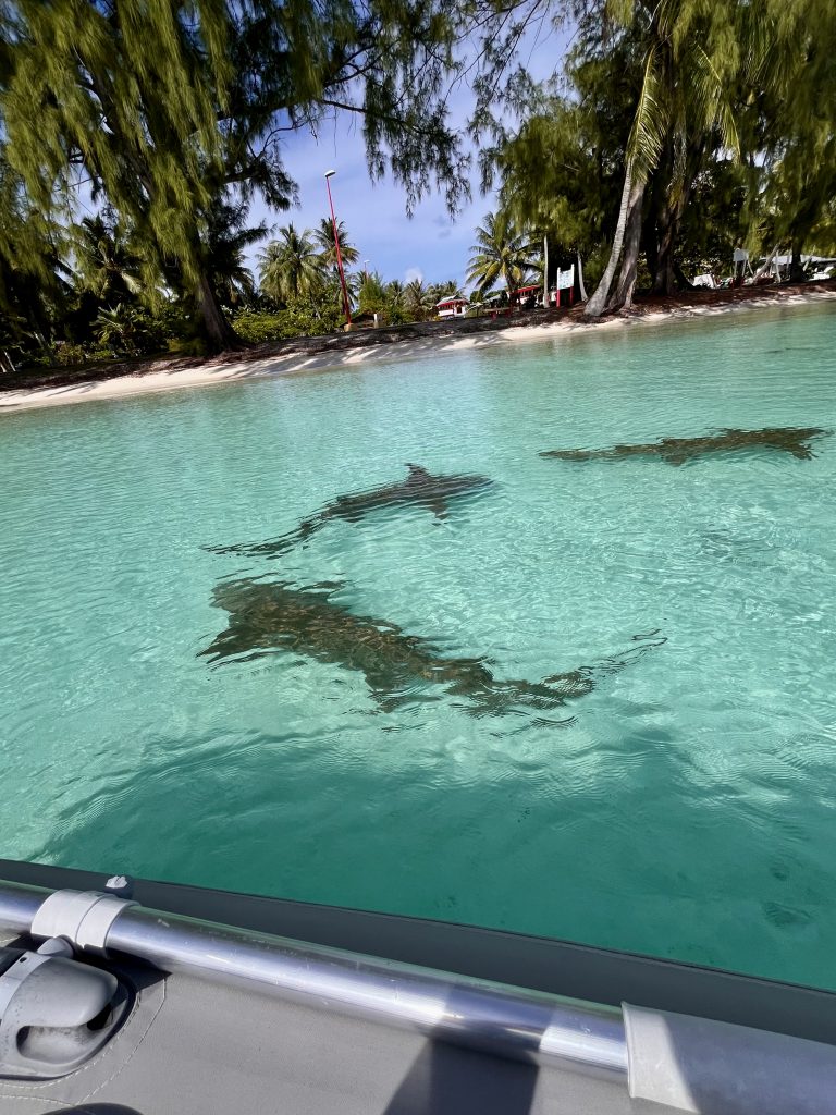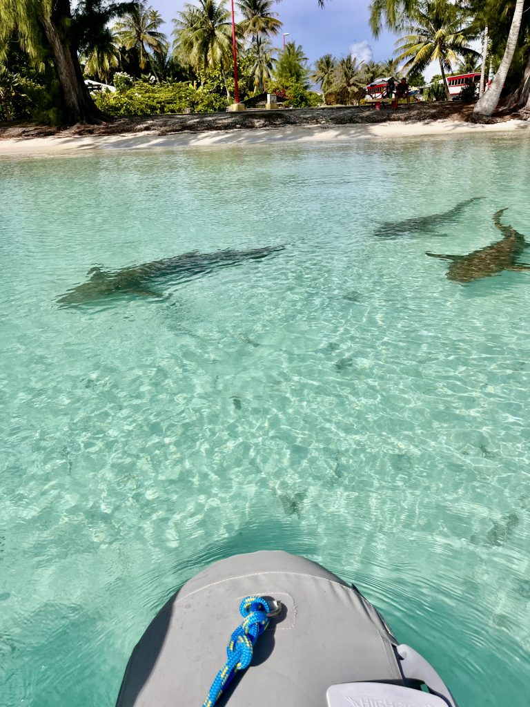 Die Atmosphäre ist wunderbar, die Luft duftet lieblich, der Vibe ist sehr entspannt. Wir laufen noch die Straße entlang und landen schnell beim Yacht Service. Unser Paket ist schnell gefunden, die Gasflasche abgegeben. Auch hier kommt uns viel Freundlichkeit entgegen. Ich sauge alles auf, wie ein trockener Schwamm. Jetzt wollen wir noch ein Häuschen weitertuckern, zur Perlenfarm mit angegliederter, kleinen Hotelanlage. Wir möchten uns dort für eine Perlenzuchtvorführung anmelden. Doch was ist denn das? Was kommen denn da für gruselige Ungetüme hinter uns her? Hilfe, 3 Ammenhaie schwimmen zielstrebig zu uns rüber.
