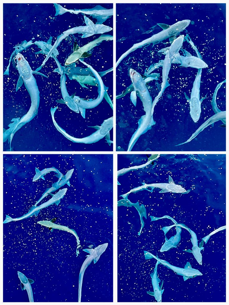 Was sind das nur dauernd für Geräusche unter unserem Boot? Ich gehe mit ein paar Haferflocken raus und werfe sie ins Wasser. Meine Güte. 🫢 Was sind das für Massen an Schiffshalterfischen, die sofort unter Yuti hervorgeschossen kommen.