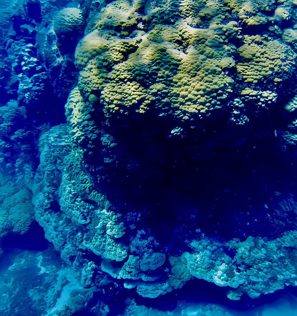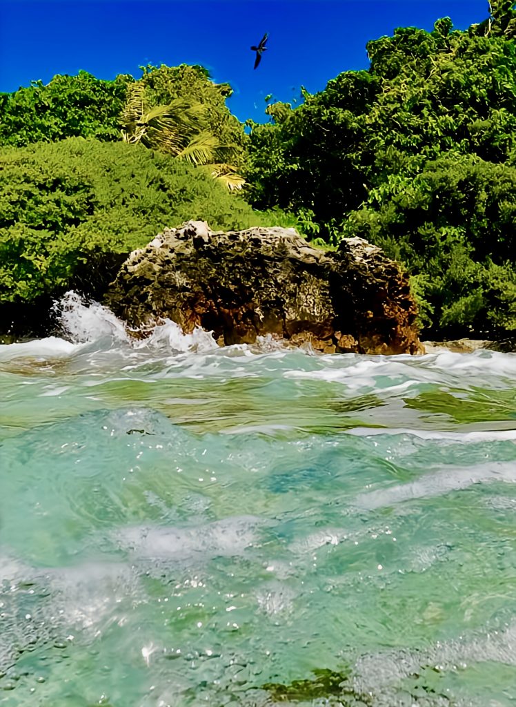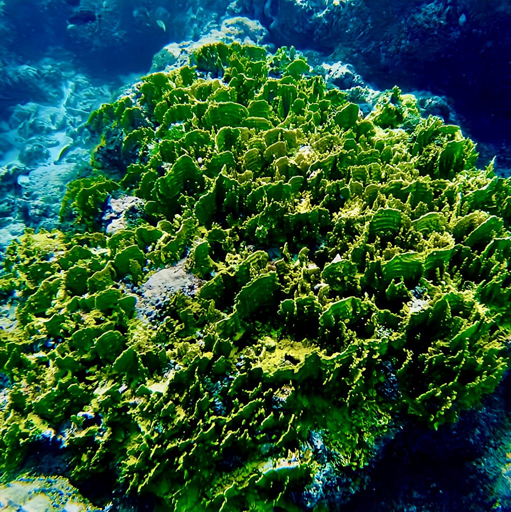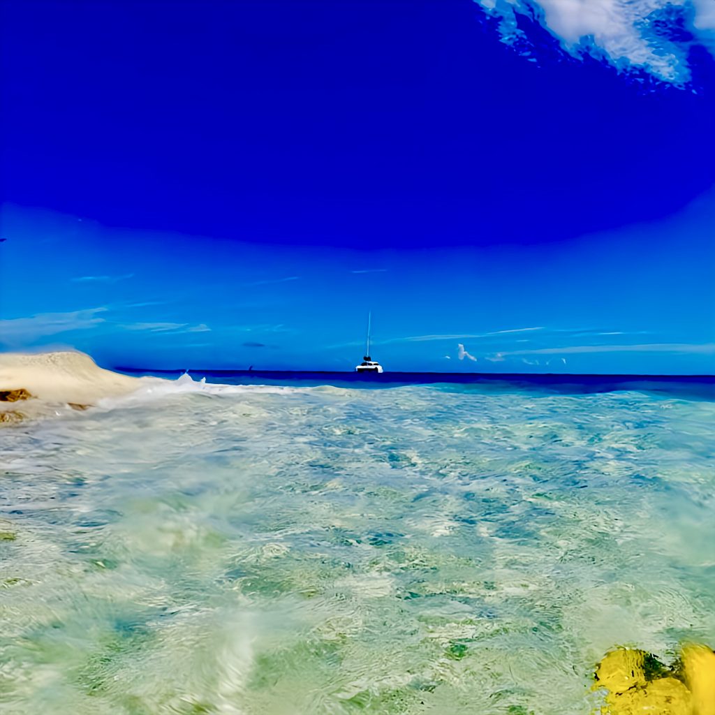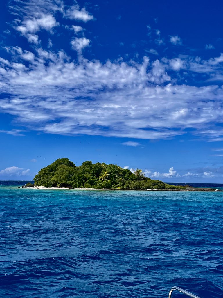 Laut der Seglerapp noforeignland gibt es nur einen kleinen Bereich, wo das Ankern für ein Boot möglich ist. Für ein Boot wohlgemerkt! Und zum großen Glück ist außer uns niemand dort oder im Anmarsch. Wir lassen den Anker fallen, und der Anker hält. 👍 Das Meer ist jedoch schon die ganze Zeit richtig kabbelig, und mich gruselt es gerade ein wenig, jetzt und hier ins Wasser zu springen. Es ist halt alles, was wir machen, ohne doppelten Boden. Wir sind hier mitten im riesigen Atoll, alleine, die See ist ruppig und ich weiß nicht, was sich hier so für Haie herumtreiben. Mensch, da frag ich doch schnell noch mal Chat GPT. Mir wird versichert, dass das Schnorcheln und Tauchen ein Highlight, die Strömung gering, nur das Betreten der Insel zum Schutz der Vögel verboten sei. Naaa guuut, ich hüpfe rein, mit Messer und Kamera. Da wir Yuti nicht unbeaufsichtigt lassen wollen, muss ich alleine schnorcheln.
