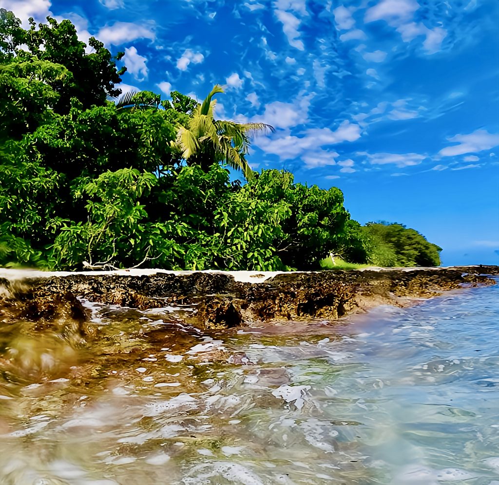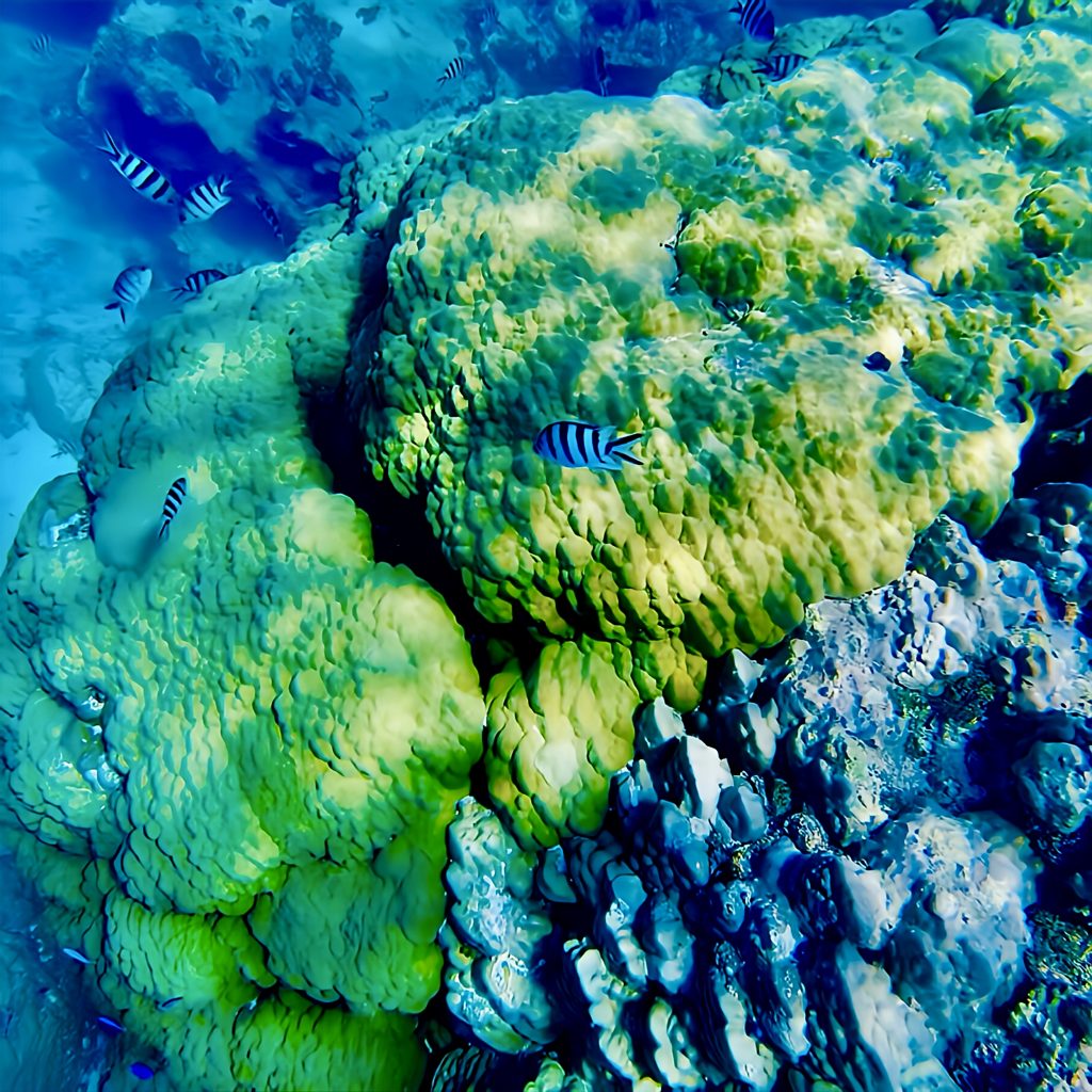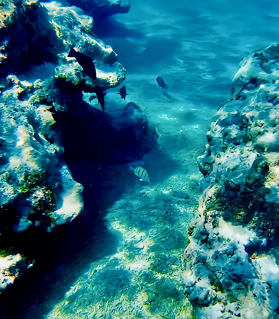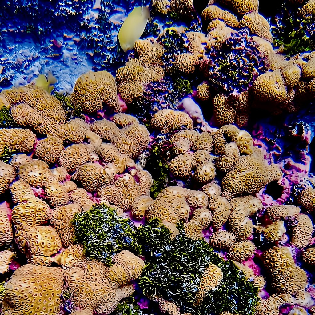 Laut der Seglerapp noforeignland gibt es nur einen kleinen Bereich, wo das Ankern für ein Boot möglich ist. Für ein Boot wohlgemerkt! Und zum großen Glück ist außer uns niemand dort oder im Anmarsch. Wir lassen den Anker fallen, und der Anker hält. 👍 Das Meer ist jedoch schon die ganze Zeit richtig kabbelig, und mich gruselt es gerade ein wenig, jetzt und hier ins Wasser zu springen. Es ist halt alles, was wir machen, ohne doppelten Boden. Wir sind hier mitten im riesigen Atoll, alleine, die See ist ruppig und ich weiß nicht, was sich hier so für Haie herumtreiben. Mensch, da frag ich doch schnell noch mal Chat GPT. Mir wird versichert, dass das Schnorcheln und Tauchen ein Highlight, die Strömung gering, nur das Betreten der Insel zum Schutz der Vögel verboten sei. Naaa guuut, ich hüpfe rein, mit Messer und Kamera. Da wir Yuti nicht unbeaufsichtigt lassen wollen, muss ich alleine schnorcheln.