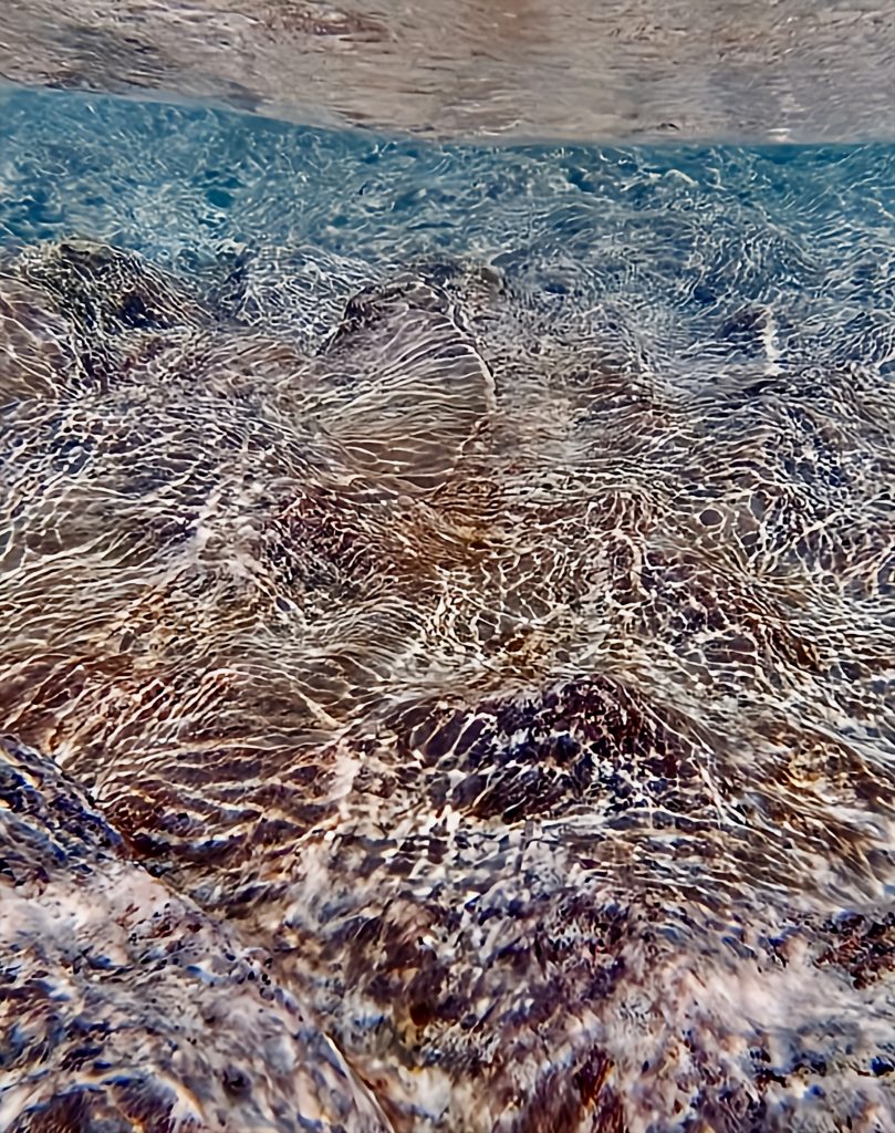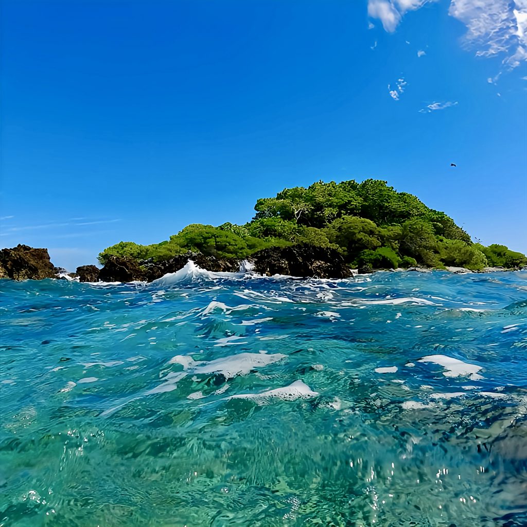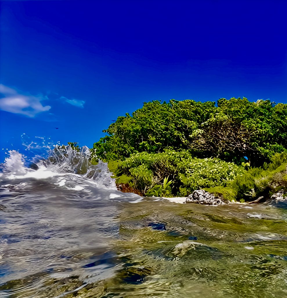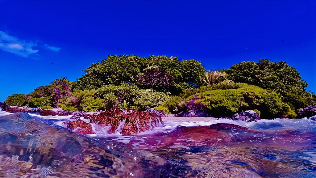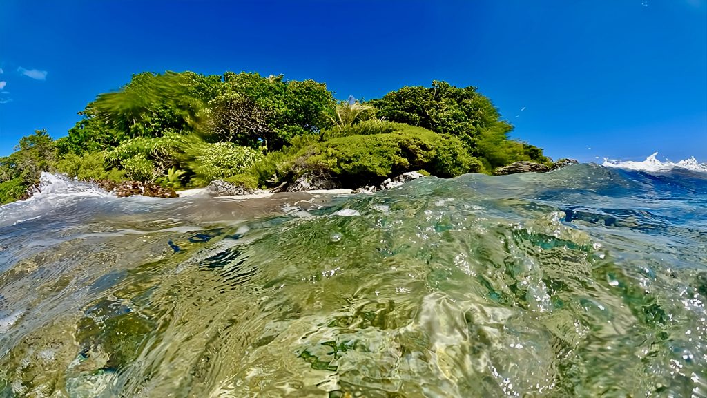 Jepp, die Strömung ist zu bewältigen. Ich schwimme direkt Richtung Inselrand, wo mich die Brandung aber gut hin und her wirft.