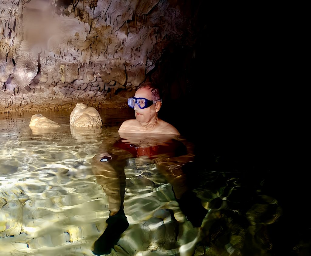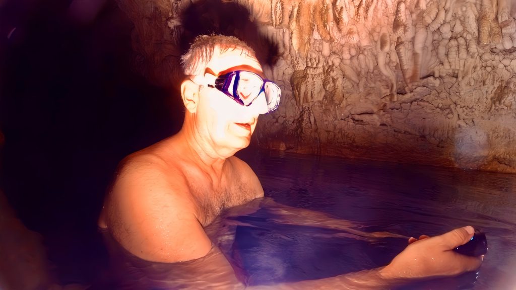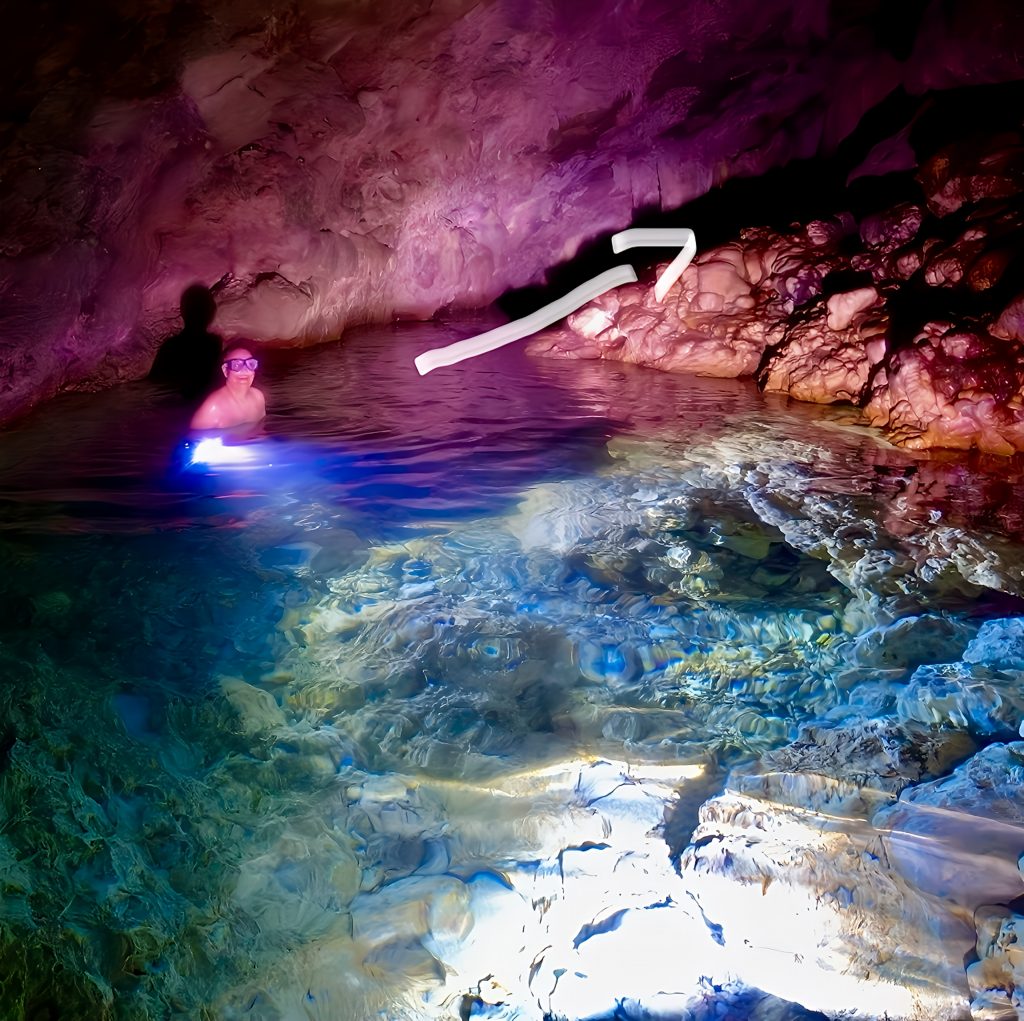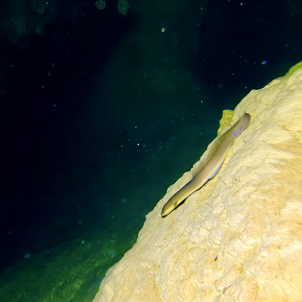 Und wo geht es da weiter? Das ist mir gerade so gar nicht klar. Erstmal ziehen wir unsere nassgeschwitzten Wanderklamotten aus und die trockenen Badesachen an. Irgendwie ist das ja ein bisschen bescheuert. Aber gut! Taucherbrillen werden aufgesetzt, die Stirnlampen lassen wir bei unseren Klamotten weiterleuchten, und mit GoPro und Wassertaschenlampen geht’s ins kalte, klare Süßwasser. Uhhhh, ahhhh, ihhhh…. Wieso ihhhh? Klaus entdeckt einen Aal.