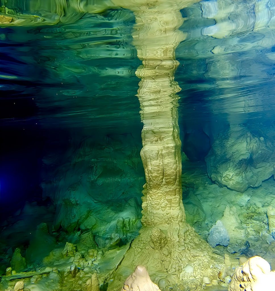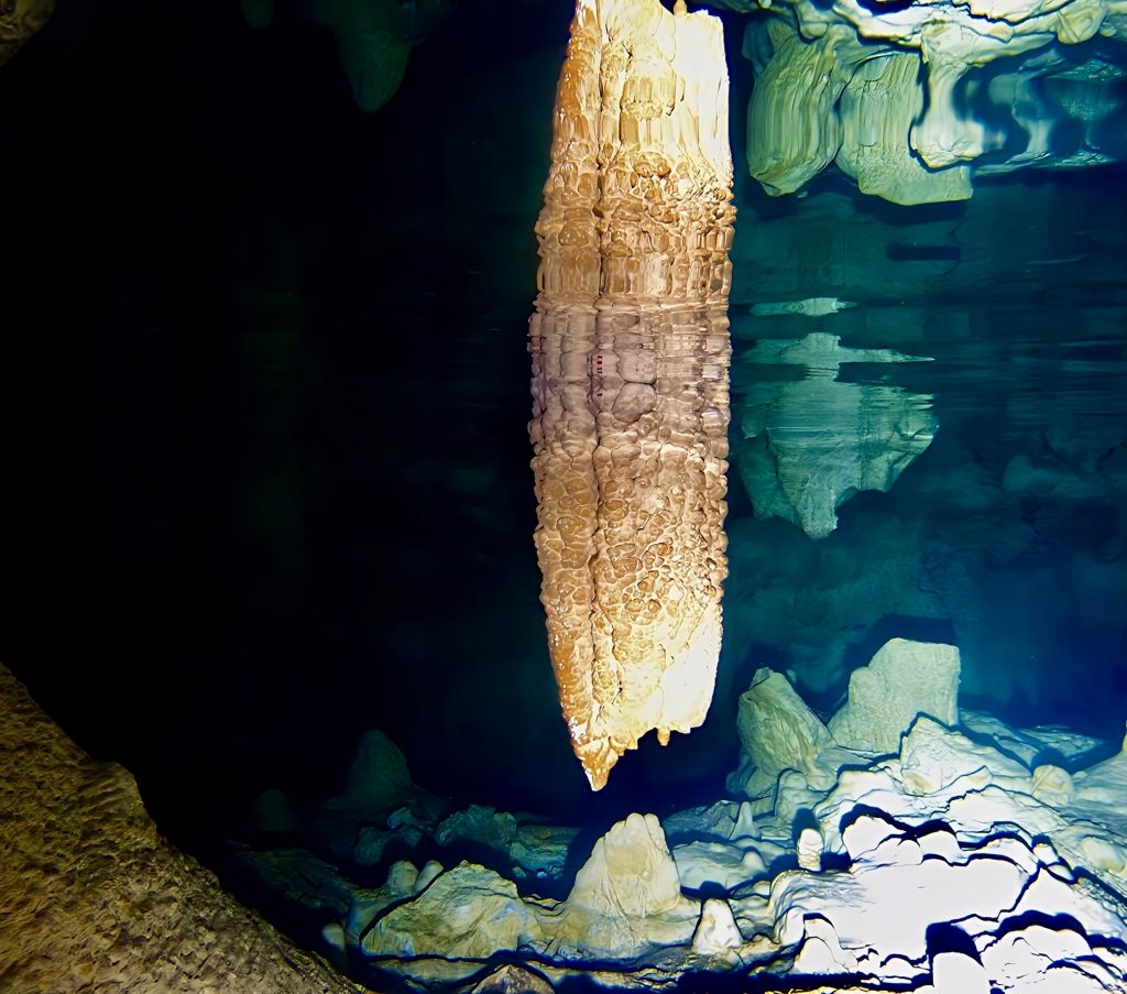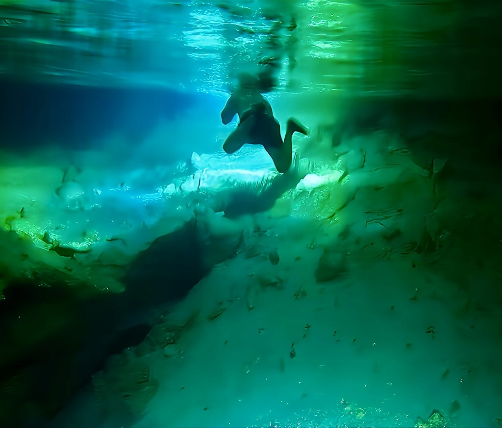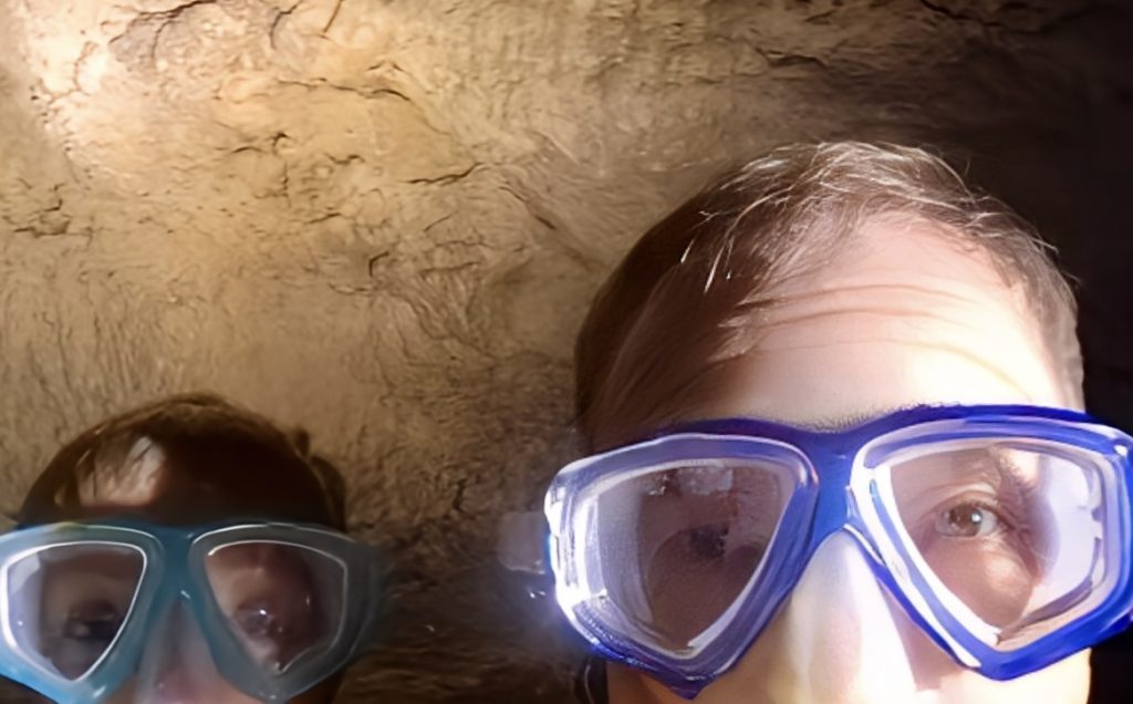 Und wo geht es da weiter? Das ist mir gerade so gar nicht klar. Erstmal ziehen wir unsere nassgeschwitzten Wanderklamotten aus und die trockenen Badesachen an. Irgendwie ist das ja ein bisschen bescheuert. Aber gut! Taucherbrillen werden aufgesetzt, die Stirnlampen lassen wir bei unseren Klamotten weiterleuchten, und mit GoPro und Wassertaschenlampen geht’s ins kalte, klare Süßwasser. Uhhhh, ahhhh, ihhhh…. Wieso ihhhh? Klaus entdeckt einen Aal.