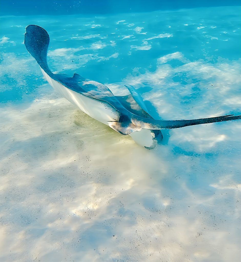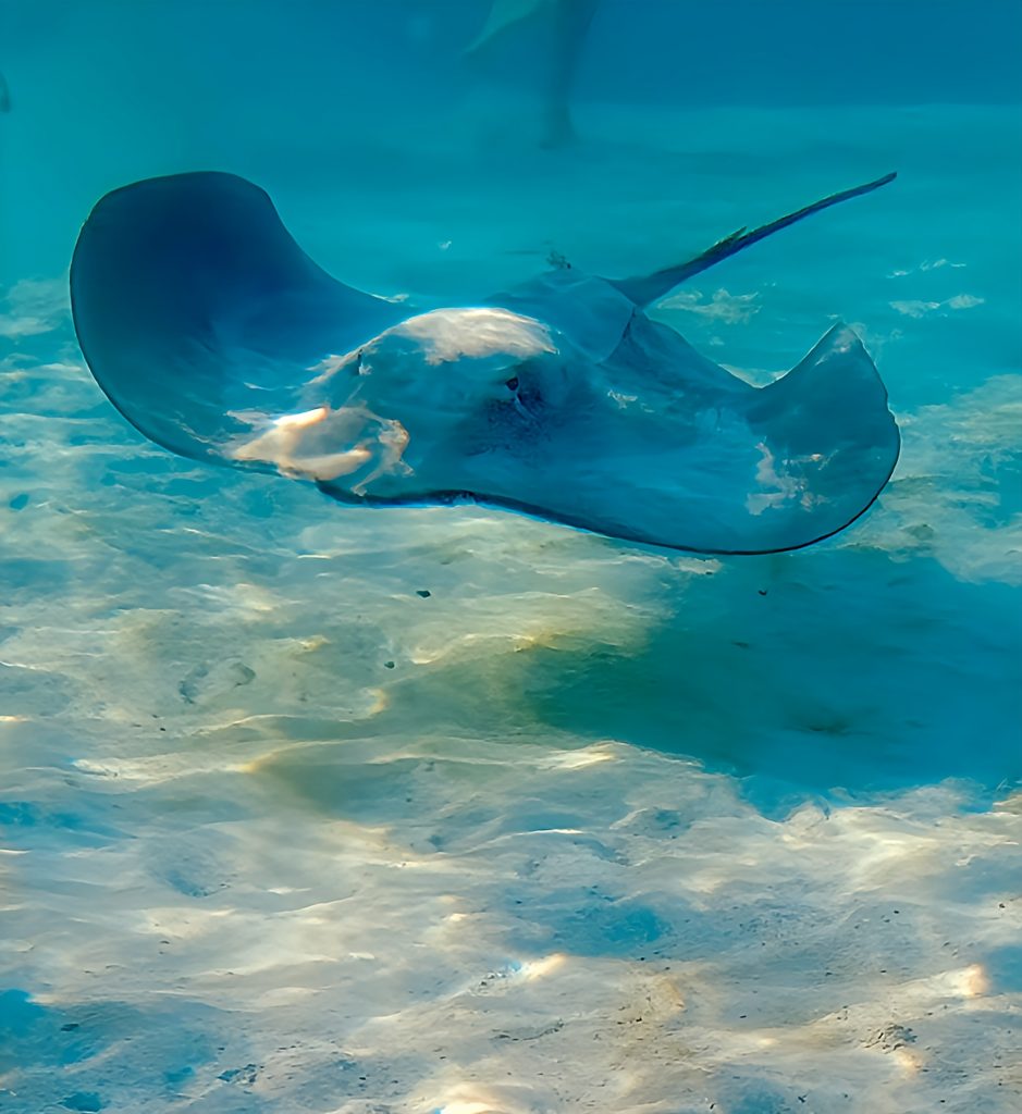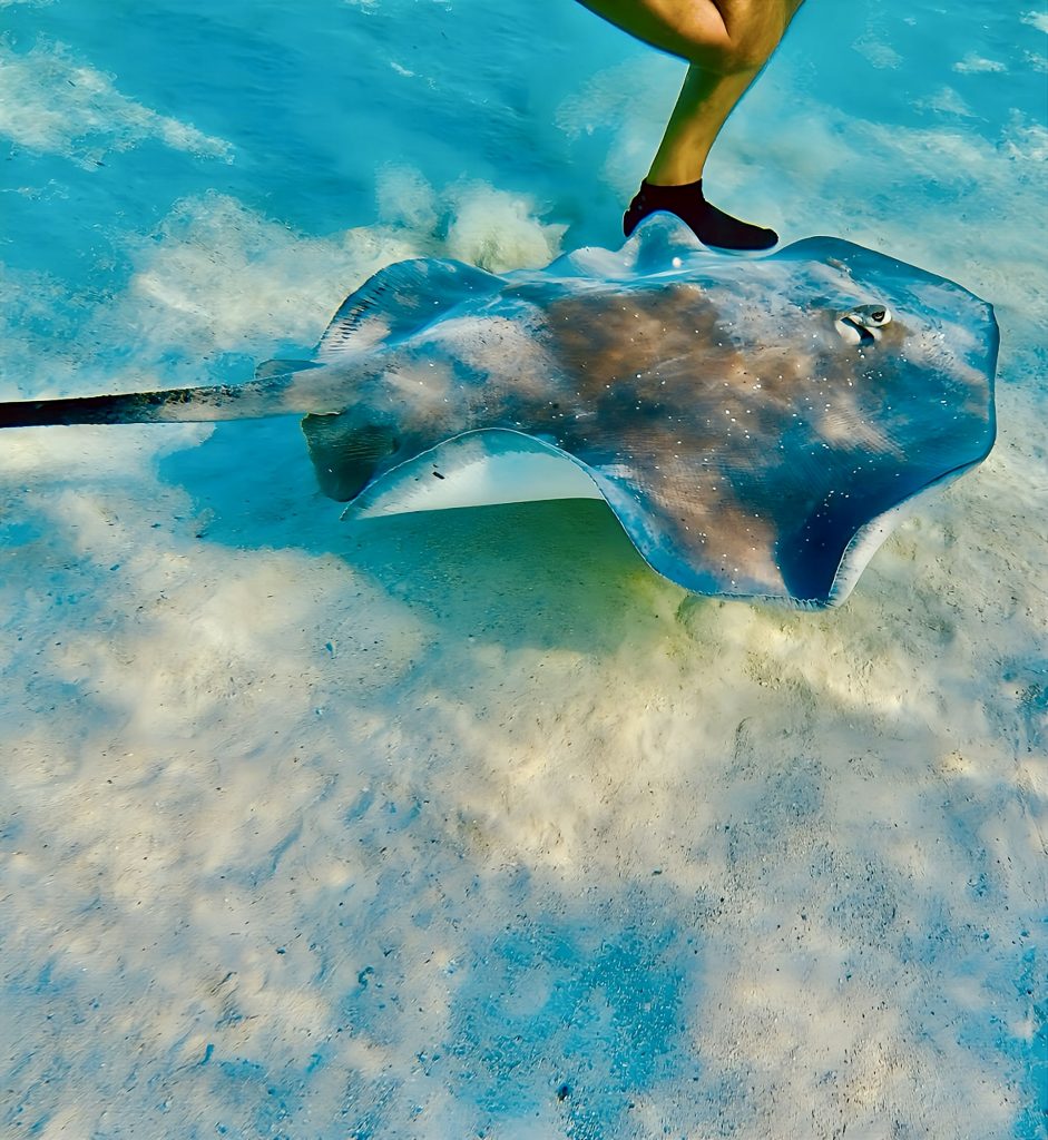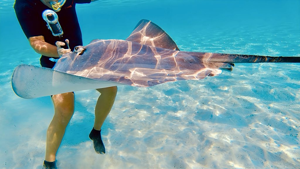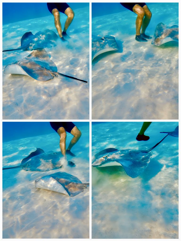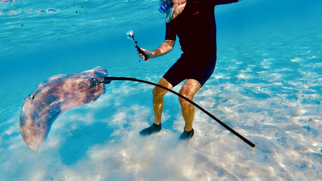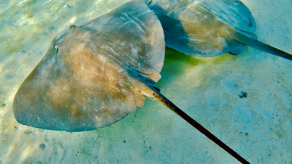 Eigentlich ist das Füttern verboten, und wir haben auch gar nichts dabei. Die Touristenguides machen es aber trotzdem, um ihre Gäste zu beglücken. Denn mit Futter in der Hand, kommen die Rochen ganz dicht an deinen Körper, ihr Maul ist ja auf der Körperunterseite. Vor wenigen Wochen, ist diese Aktion aber voll nach hinten losgegangen. Selbstverständlich kommen auch Riffhaie dazu. Einer war so stark seinem Fresswahn verfallen, dass er einer Touristin in den Arm gebissen hat. Sie kam ins Krankenhaus und wurde genäht. Sie hat es wohl soweit gut überstanden, aber das kann halt passieren, bei all dem Tumult. Die Stachelrochen kennen seit Jahren den Ablauf und kamen bisher nicht auf die Idee, ihren Stachel abwehrend oder schlimmstenfalls tödlich einzusetzen. Wenigstens etwas… 🤪.