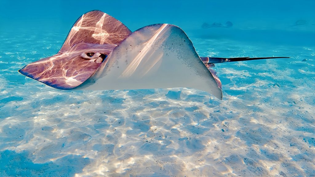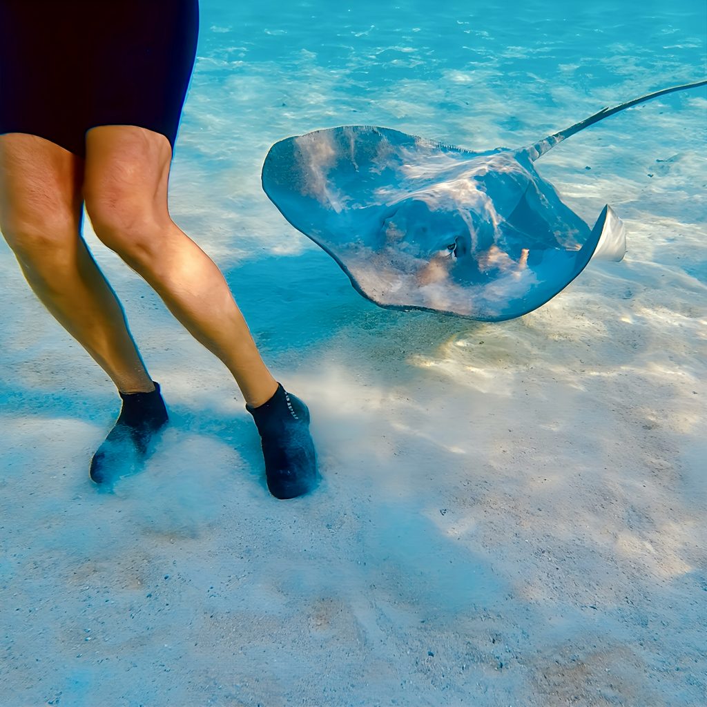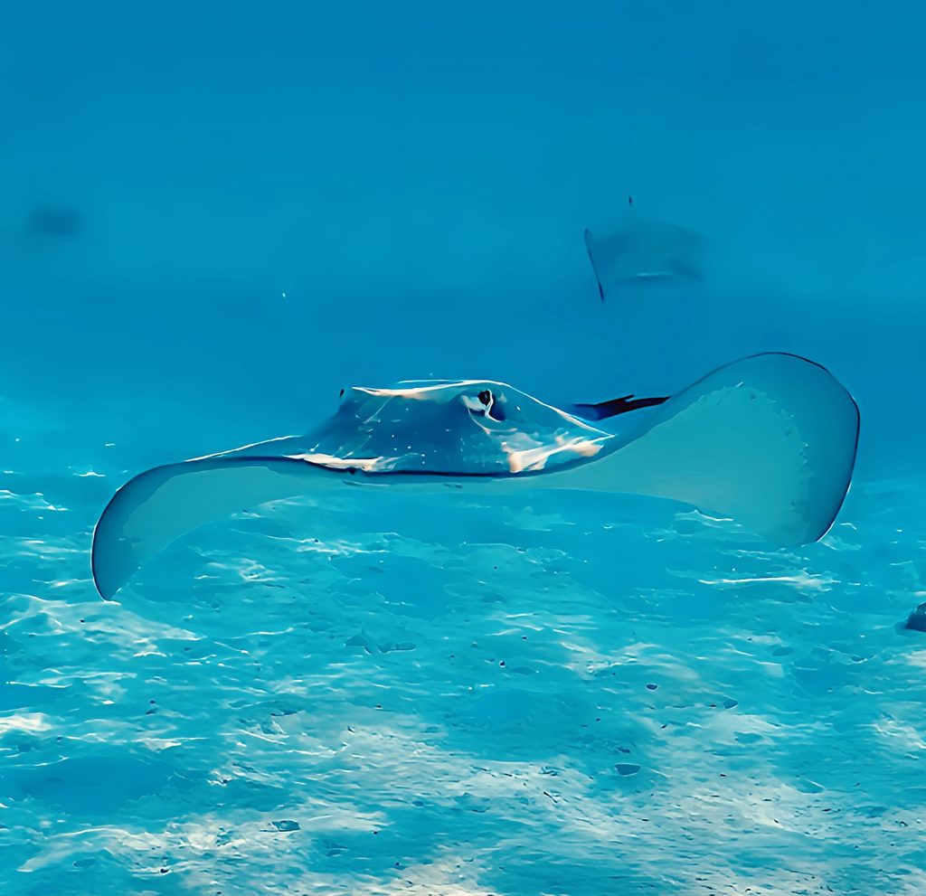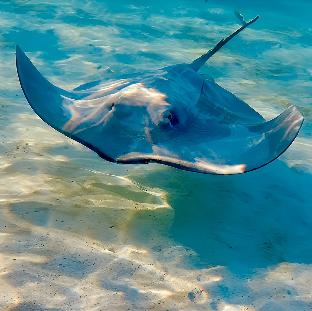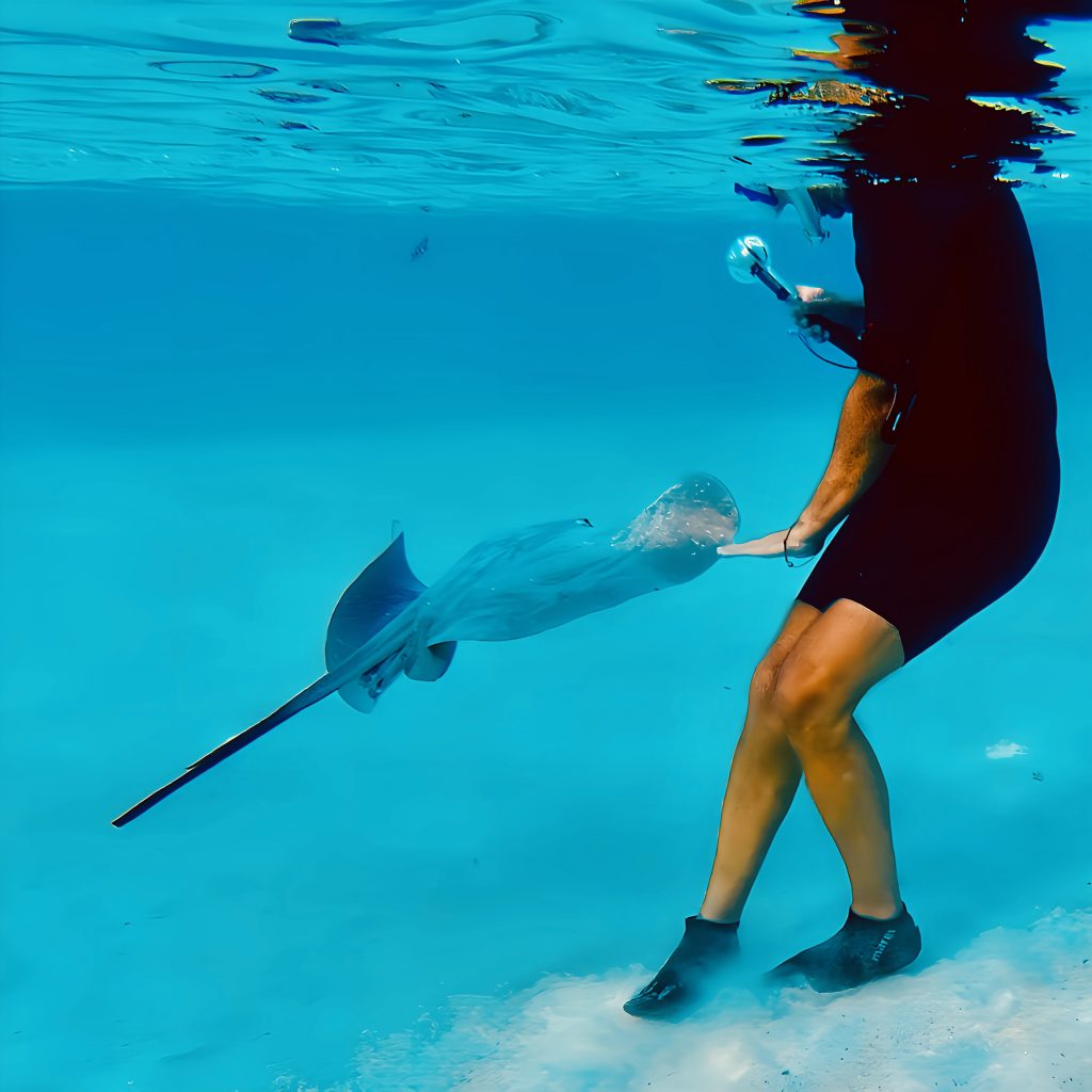 Eigentlich ist das Füttern verboten, und wir haben auch gar nichts dabei. Die Touristenguides machen es aber trotzdem, um ihre Gäste zu beglücken. Denn mit Futter in der Hand, kommen die Rochen ganz dicht an deinen Körper, ihr Maul ist ja auf der Körperunterseite. Vor wenigen Wochen, ist diese Aktion aber voll nach hinten losgegangen. Selbstverständlich kommen auch Riffhaie dazu. Einer war so stark seinem Fresswahn verfallen, dass er einer Touristin in den Arm gebissen hat. Sie kam ins Krankenhaus und wurde genäht. Sie hat es wohl soweit gut überstanden, aber das kann halt passieren, bei all dem Tumult. Die Stachelrochen kennen seit Jahren den Ablauf und kamen bisher nicht auf die Idee, ihren Stachel abwehrend oder schlimmstenfalls tödlich einzusetzen. Wenigstens etwas… 🤪.