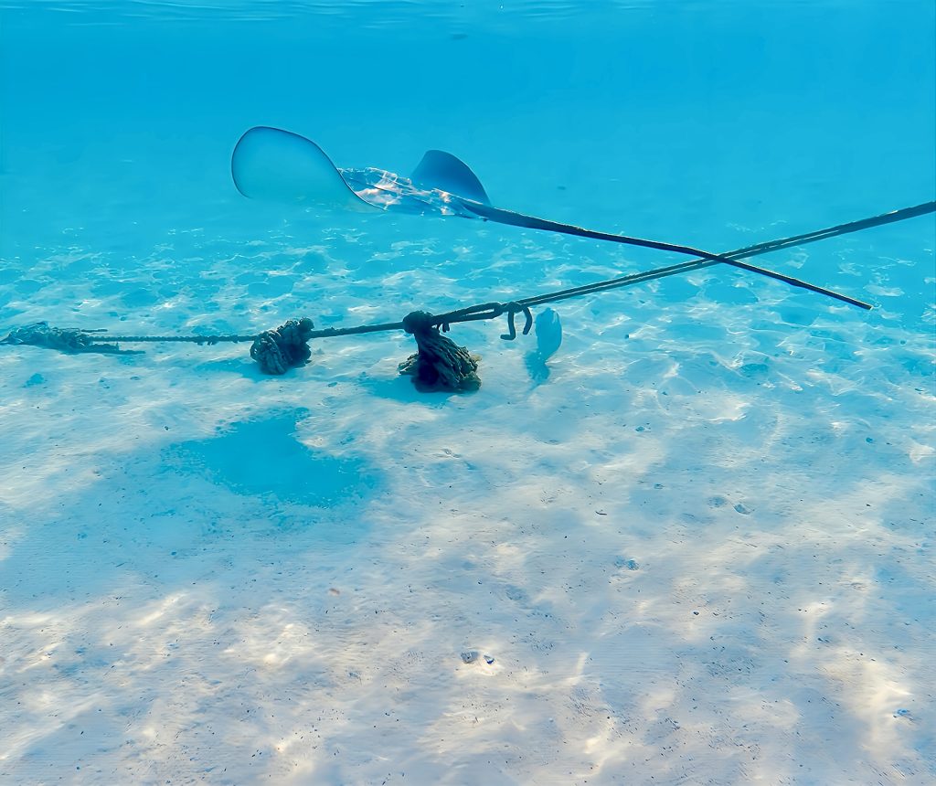 Nichtsdestotrotz, wir quetschen uns auch noch hinein! Zwar stehen wir jetzt etwas im Weg, den die Touriboote immer zu den Rochen nehmen, zudem recht dicht an den nächsten Bommies, und wir haben nur noch 50 Zentimeter Wasser unter den Kielen. Uiuiui, echt knappe Sache. Ich könnte also neben dem Boot stehen, und mein Kopf würde mit der Nase noch rausschauen. 🫣