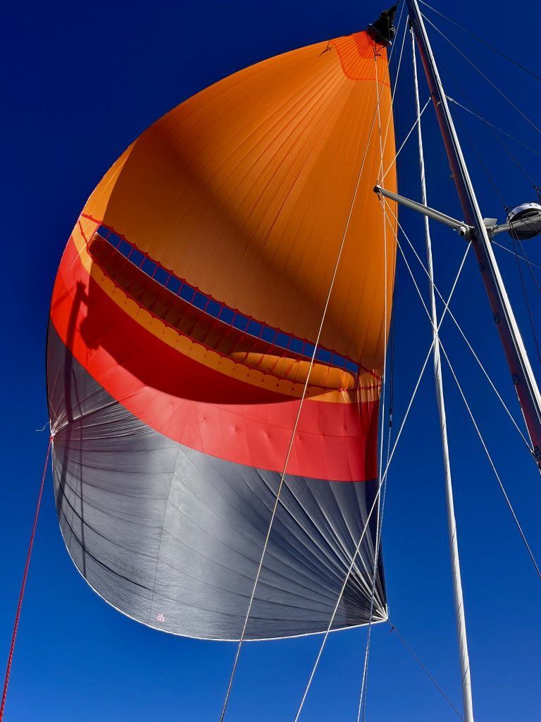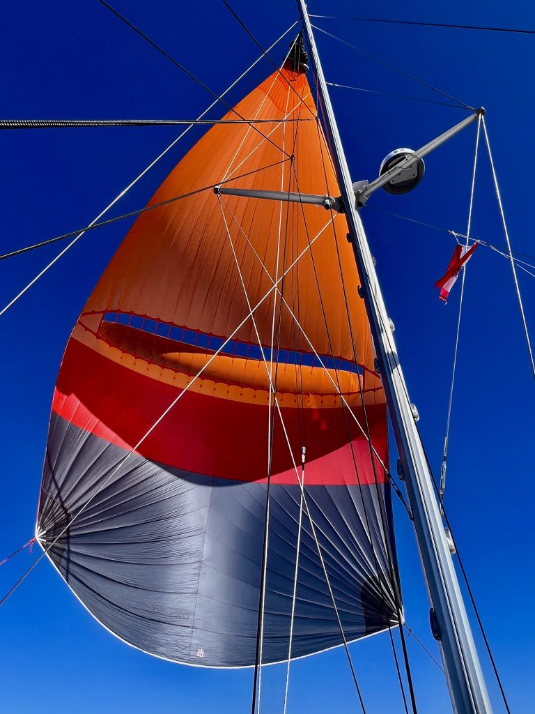 Acht Stunden genießen wir die Fahrt mit diesem Segel, dann, um 18:00 Uhr lassen wir schweren Herzens die Hose runter. Ein Wolkenband macht sich auf den Weg zu uns, und wir wollen ja nichts riskieren. Darum wird nun die Bergesocke oder Bergehose wieder heruntergezogen und das Segel abgebaut. Auch dieser Vorgang klappt bestens. 😊 Ehrlich? Wir hatten schon ordentlich Schiss in der Büx, so beim ersten Mal! Und was kommt jetzt raus? Das lütte Jib kommt jetzt raus. Aber auch damit fahren wir immerhin gute 4 Knoten. Passt! 👍 Ab durch die Nacht…