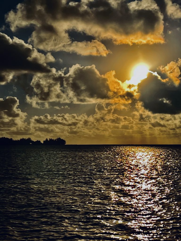 Oh meine Güte! Was gibt das denn jetzt für ein Wettrennen hinter‘s Riff?? Vier Boote vor uns und 2 hinter uns, und alle geben Gas wie blöde. Ich will jetzt aber nicht von noch mehr Booten überholt werden! Klaus, gib Stoff!! Beide Maschinen volle Kraft voraus! Oh ha, das verbrennt Diesel, da kannst du aber zuschauen! Wissen die anderen Boote mehr als wir? Zu blöd, dass die jeweilige Bojenzahl nicht komplett bekannt ist, und nicht alle, was sag ich, kaum jemand sein AIS benutzt. So tappt man bis zum Schluss im Dunklen. Klaus saust mit Yuti um die Kurve. Oh, das Ankerfeld zur Rechten sieht schon gut voll aus. Der Ankerbereich gerade aus, vor dem Bora Bora Yacht Club, ist noch nicht wirklich einsehbar. Dann wäre da noch ein Bereich vor der berühmten Kneipe “Bloody Mary”, die aber zur Zeit wegen Renovierungsarbeiten geschlossen ist, die Kneipe, aber nicht das Bojenfeld und ein Bojenfeld links im Atoll, rum um den Berg. Also? Wohin jetzt? Links, rechts, geradeaus, zur blutigen Marie???