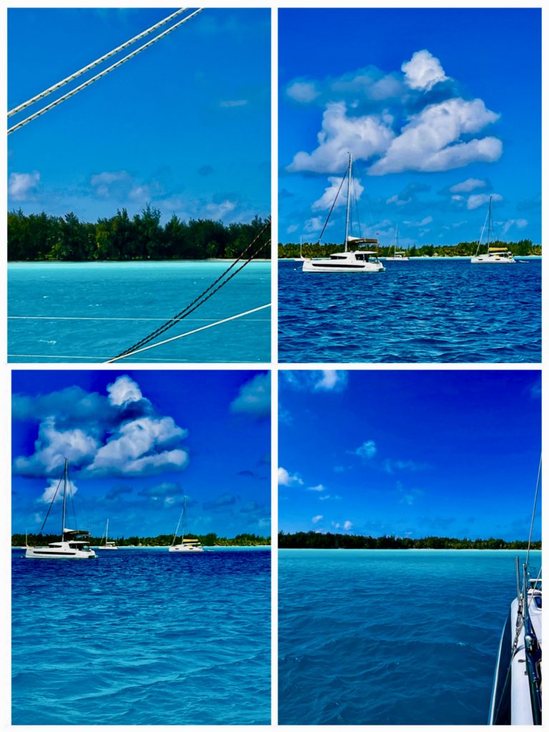 Gehen wir heute zu unserem Ehrentag, unsere beste Trauzeugin der Welt, Kerstin, hat uns schon gratuliert, ins Bora Bora Yacht Club Restaurant essen? Oder riskieren wir die kitzelige, innere Inselrundfahrt, vorbei an allen Luxus Resorts? Wir überlegen noch, da kommt der Kassierer des Bojenentgelts mit seinem Motorboot angedüst. Komm, den fragen wir mal. Ja, gefährlich sei die Tour nicht, man fährt 2 mal an roten und grünen Tonnen vorbei, peilt dann das erste Hotel Resort an und bleibt dicht an den gesamten Hotelanlagen. Die Tiefen seien für uns mit dem Kat kein Problem. Okay, dann machen wir das. Zwei Nächte wollen wir insgesamt bleiben und zahlen läppische 35,- Euro pro Nacht. Die Boje hinter dem Berg ist dann auch schon abgegolten. Prima❣️Na dann ziehe ich mal unsere schwer montierten Leinen aus der Bojenöse wieder heraus und wir motoren los.