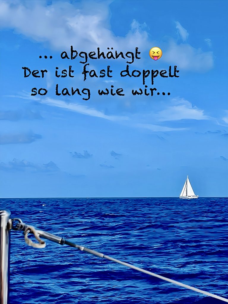 Ja, das ist schon komisch! Denn dieses Boot mit seinen 22 Metern Länge und voller Besegelung müsste für uns eigentlich nicht zu packen sein. Länge macht Geschwindigkeit und diese Yacht ist 10 Meter länger als Yuti… 🤷. Sowas macht Klaus aber so richtig Spaß, das kannst du wohl glauben. 😎