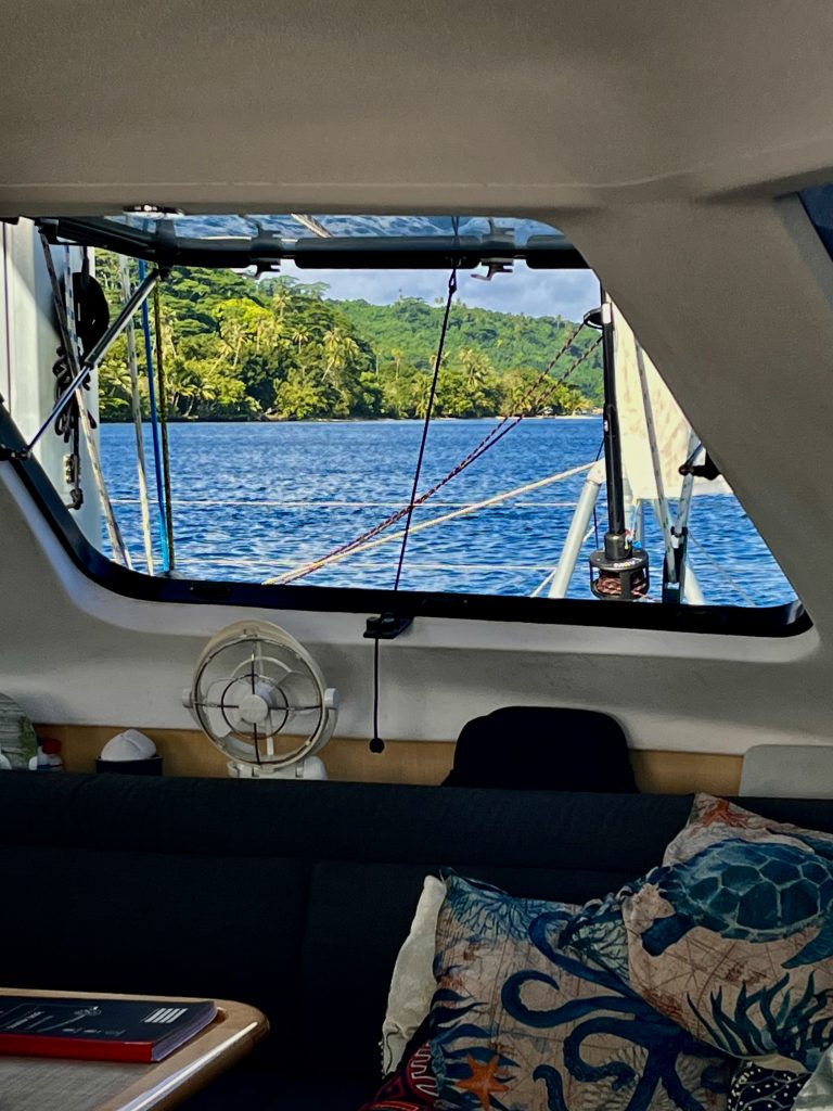 Wir sollten uns etwas sputen, denn um 17:00 Uhr bekommen wir Besuch. Wer kommt? Jörg und Judith, ein deutsches Paar, etwa in unserem Alter. Bevor wir vorhin an Land sind, haben wir einen kurzen Abstecher zu ihrem Boot gemacht, um Hallo zu sagen. Ist man irgendwo neu angekommen, checkt man erstmal die Lage. Wer liegt noch so an den Bojen und so weiter… Findet man, wie wir jetzt, ein deutsches Boot, nimmt man meistens Kontakt auf. Und überwiegend sind die Leute nett und interessant. So auch diese beiden. Er segelt schon seit 7 Jahren, meistens im Mittelmeer und mit seiner Frau. Die ist aber plötzlich und unerwartet an Krebs verstorben und so segelte er mit seinem Freund zusammen von Panama nach Französisch Polynesien. Vorherige Atlantiküberquerung versteht sich. Auf den Marquesas angekommen, sein Freund musste wieder nach Hause, gibt er eine Annonce auf: „Hand gegen Koje.“ Soweit so gut. Am anderen Ende der Welt in Deutschland sitzt Judith. Nach einer nach 30 Jahren gescheiterten Ehe, keine Kinder, überlegt sie sich, was ihr nun Spaß machen könnte. Tja, da gab es doch mal nen Segeltörn, noch in ihrer Jugend. Das wäre doch was. Sie meldet sich auf „Hand gegen Koje“ und lernt Jörg kennen. Er fliegt für das Kennenlernen extra nach Deutschland. Sie beschnuppern sich und befinden die Idee für gut. Er fliegt wieder zurück, sie folgt etwas später. Nun segeln sie seit 3 Monaten zusammen durch Französisch Polynesien und sind ein Paar geworden. Wenn das keine wunderschöne Geschichte ist, gell?!! 🥰 Mittlerweile möchte er seinen Monohull gerne gegen einen Katamaran tauschen, damit etwas mehr Bequemlichkeit ihr Leben an Bord bereichert. Am Wochenende schauen sie sich 4, zum Verkauf stehende Kats an. Auch sein Boot müsste entsprechend den Besitzer wechseln. Wir sind überrascht, ein wirklich großes Projekt haben sie sich da vorgenommen. Aber ihr Lebensweg beweist, sie sind weder Träumer noch Angsthasen. Sie sind unglaublich mutig und packen ihr Leben an. Toll❣️ Wir drücken die Daumen und sehen sie vielleicht im Herbst in Neuseeland wieder. Wir sind gespannt!!!