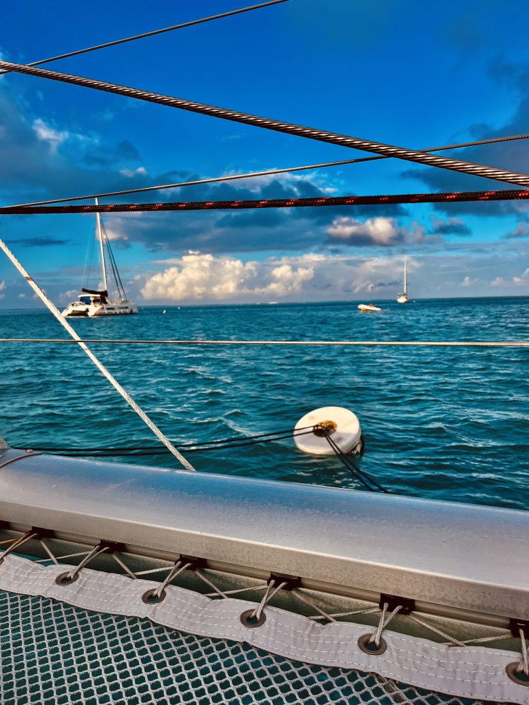 Wir streben ein großes, öffentliches Bojenfeld an. Das ist geradezu billig, liegt aber ein paar Kilometer vom Dinghy Dock entfernt. Schon leuchten uns freie Bojen entgegen. Prima! Wir suchen uns eine aus. Klaus steht wieder mit dem Zauberhaken vorn, ich hinten am Steuerstand. Der Wind ist sanft und das Festmachen an der Boje klappt super. Na also! Auch hier werden wir beobachtet. 😎