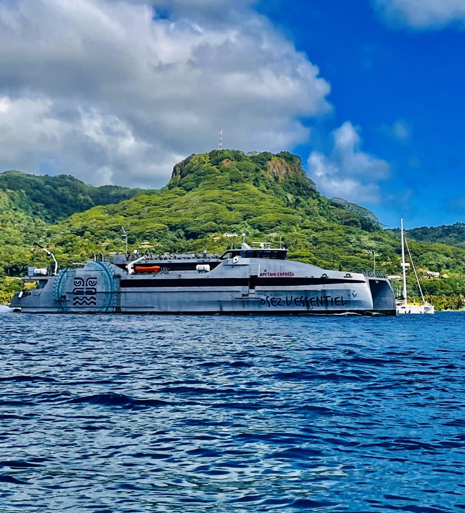 Es ist gut besucht das chinesische Lokal und wir bestellen. Schade, Ente gibt es heute nicht. 😔 Dann eben Garnelen mit Broccoli und Rindfleisch mit Ananas. Nun heißt es warten und warten und warten und nochmals warten. Das kann doch nicht sein?! Später gekommene Gäste spachteln schon fleißig. Sie haben uns vergessen, wieder einmal. 😕 Und dann, als unsere Bestellungen endlich kommen, fehlt der Reis. Ein Chinese, der seine Gerichte ohne Reis serviert? Das gibt’s doch gar nicht!!? Doch, hier gibt es das. Der Reis geht extra. Na gut, dann eben noch ein Schälchen Reis, bitte. Alles in allem schmeckt’s gut, aber meine beste Bewertung würde ich nicht aussprechen. Jetzt geht’s noch in den Supermarkt, der genau gegenüber des Dinghy Docks liegt. Wow, der ist aber gut sortiert, und so kaufen wir viel mehr, als eigentlich gedacht. Billiger als auf den Tuamotus ist es allemal, deshalb lassen wir auch „nur“ gute 200,- Euro dort. 😅 Wir tuckern den doch recht langen Weg zurück zum Bojenfeld, eine Fähre legt ebenfalls ab.