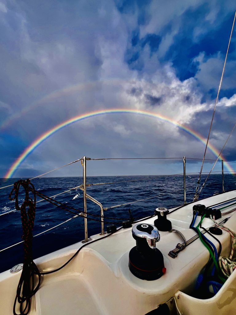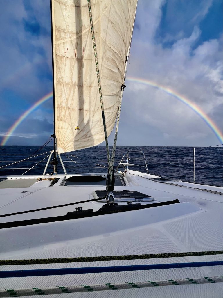 Der Freitag wurde mal eben verschluckt, der Datumsgrenze sei es geschuldet. Nun sollten wir langsam machen. An Amerikanisch Samoa sind wir bereits vorbei und erreichen bald West Samoa, mit Apia als Hauptstadt. Vor 9:00 Uhr morgens brauchen wir uns dort gar nicht blicken lassen, da Port Control erst ab 9:00 Uhr besetzt ist. Ohne ausdrückliche Erlaubnis dürfen wir unter keinen Umständen in den Hafenbereich einfahren, so sagte man uns. Also fahren wir erstmal noch unter einem schönen Regenbogen hindurch.