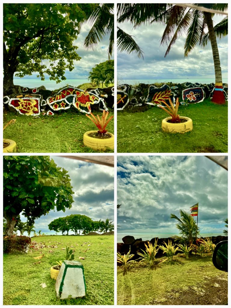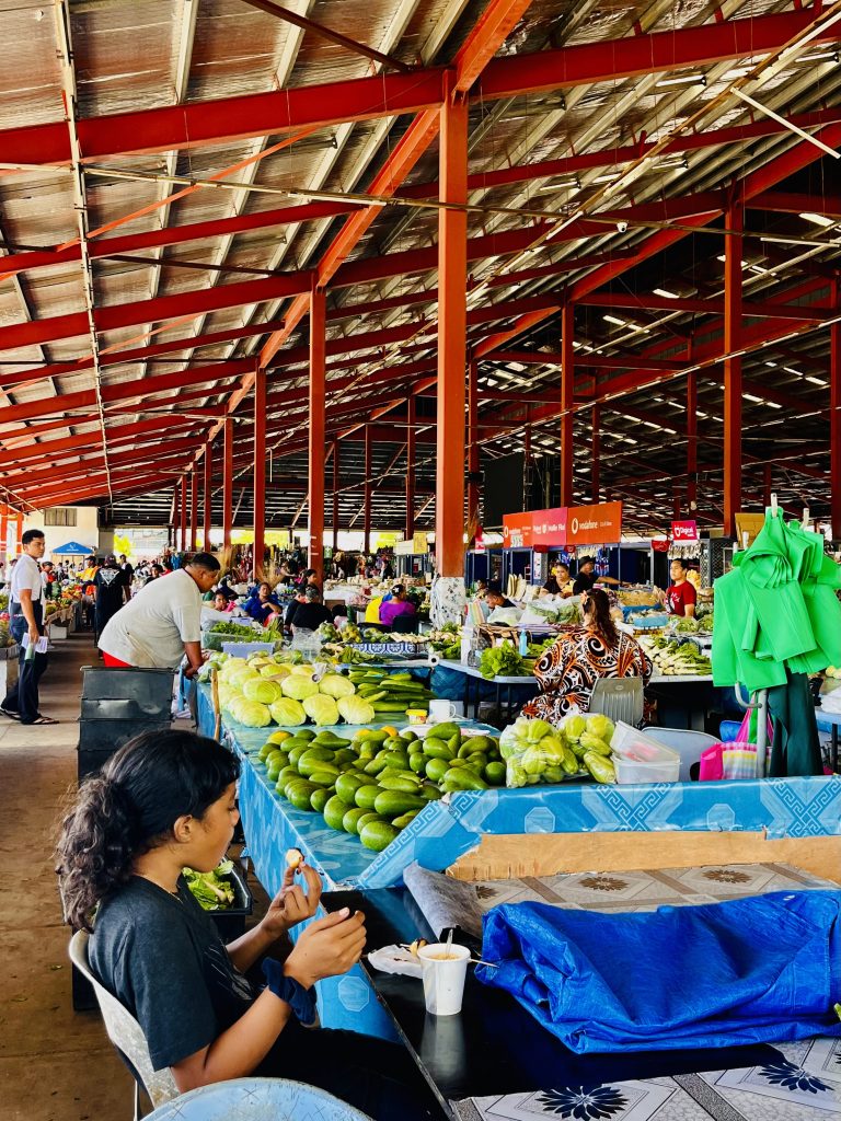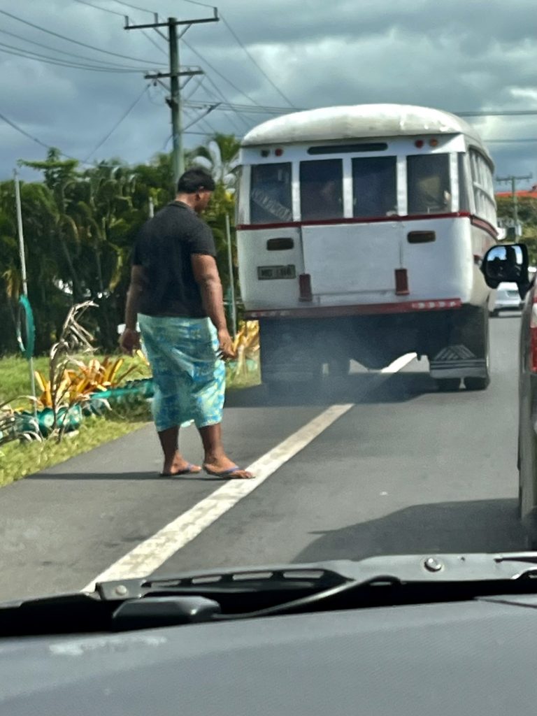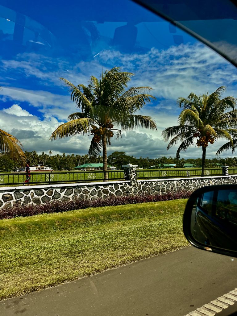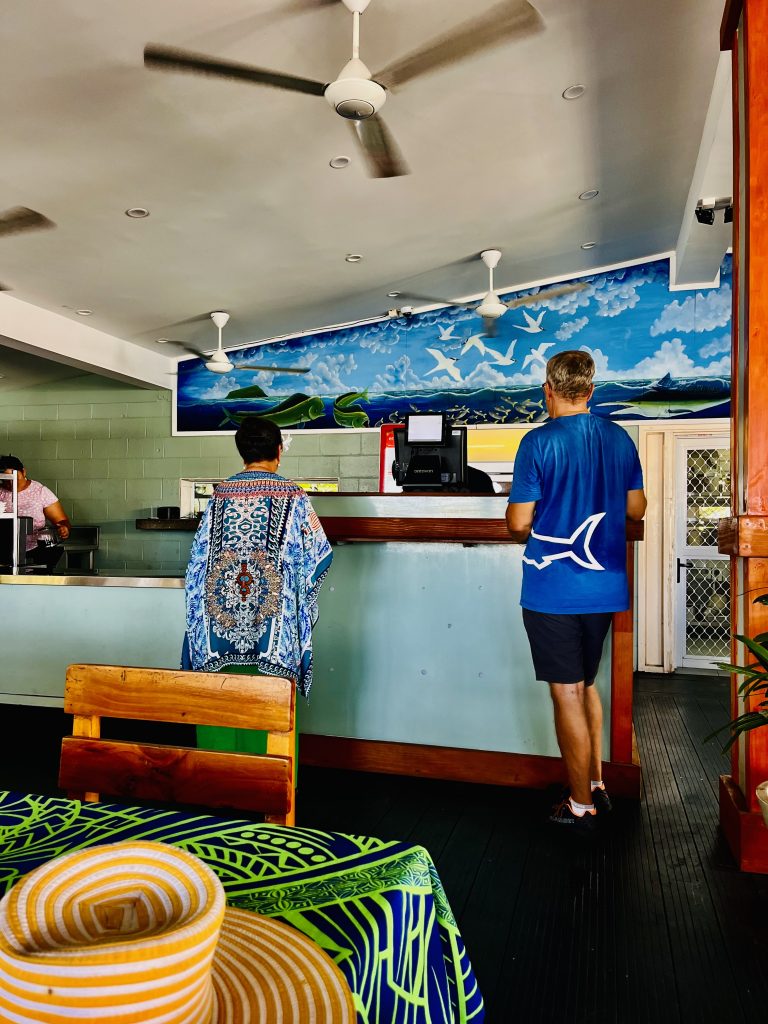 Heute steht der Dieselkauf im Vordergrund. Zuerst gießen wir, das heißt Klaus, alle 6 Kanister à 20 Liter in unsere beiden Tanks. Das klappt super, kein Tropfen geht daneben, aber anstrengend ist dieses Unterfangen immer. Ich helfe, so gut es geht. Dann fahren wir an Land, packen die gut abgewischten Kanister ins Auto und fahren erstmal in die Stadt. Dort besuchen wir das wirklich nette Café „Milani“ und wollen erst einmal frühstücken. Toll voll ist es hier, wir finden aber noch ein Plätzchen. Die Bedienung ist super nett und möchte erstmal wissen, was Thank You, fa‘afetai, auf Deutsch heißt. Dankeschön 😊. Sie merkt es sich und spricht es richtig gut aus. Nett❣️Klaus verschmatzt ein dickes Lachscroissant und ich einen bunten Salat mit Rühreistreifen und knusprig gebratenem Speck. Es schmeckt prima❣️Danach möchte ich noch in einen größeren Klamottenladen und erstehe 2 hübsche Kleider. Einer Straßenverkäuferin nehme ich noch einen geflochtenen Fächer ab, dann geht’s wieder ins Auto und weiter auf unserer Inseltour, diesmal gen Westen. Nee, stopp, da war doch noch was. Ein Mann spricht uns an und meint ganz fröhlich, wir kennen uns doch! Hmmm…? Na von der Immigration! Ach so, ach ja…Er quasselt auf uns ein und luchst uns mal ganz nebenbei 100 Tala, zur Unterstützung seines Fußballclubs, ab. Zwei einfache Halsketten drückt er uns noch in die Hände und zieht fröhlich weiter, nachdem er uns noch den Marktplatz schmackhaft gemacht hat. Also ehrlich, wir kennen den Mann irgendwie nicht, erinnern uns auch nicht an ihn. Wahrscheinlich sind wir eben mal ganz erfolgreich abgezockt worden. 🫣 Aber zum Markt will ich jetzt auch noch. Wir laufen in die besagte Richtung, finden aber nichts. Es wird industrieller und Klaus hat seine berechtigten Zweifel. Werden wir gleich überfallen? Neiiin! Etwas weiter kommt dann die große Markthalle,…