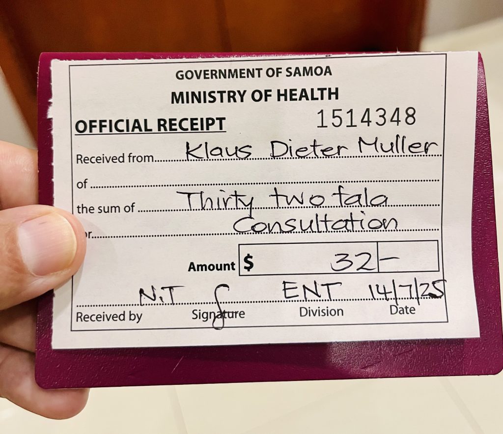 Am nächsten Morgen hört er auf dem rechten Ohr nicht mehr viel, empfindet Druck und leichte Schmerzen. Er sucht schon mal nach einem Ohrenarzt, hier in Apia. Er bräuchte eine Ohrenreinigung mit Sauger und dann wahrscheinlich noch Ohrentropfen. Ich glaube, das sucht er hier vergebens. Aber Klaus gibt nicht auf und sucht weiter, stundenlang und wird tatsächlich sehr viel später fündig. Morgen werden wir das größte Krankenhaus der Insel aufsuchen, auch wenn die Kommentare, zumindest über den Zustand des Hauses, unterirdisch sind. 🏥