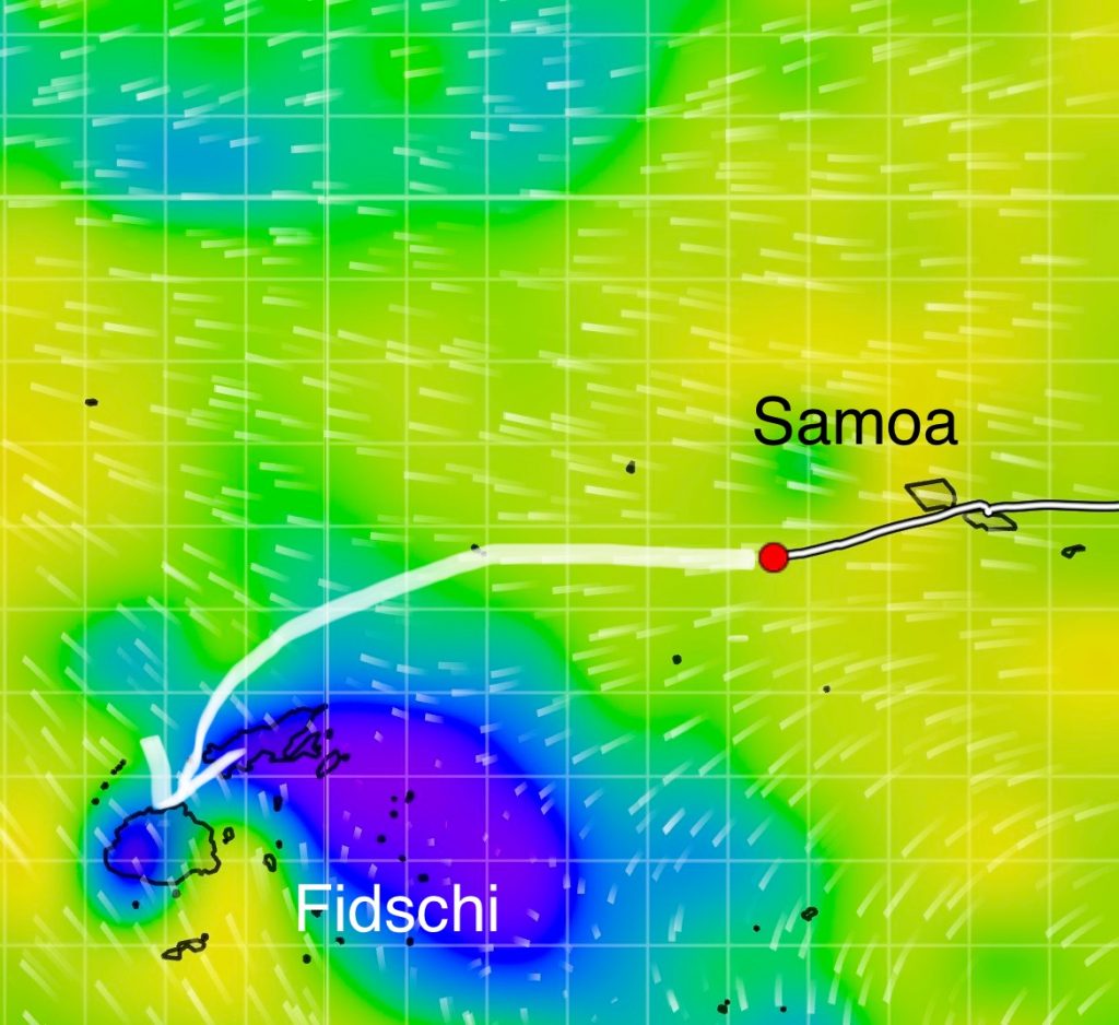 Jetzt kommen die Karten auf den Tisch. Oh, oh, oh,… Aber klar, bei wenig Wind segeln wir zur Zeit maximal 2 Knoten, manchmal noch weniger. Der regelmäßige Wettercheck sagt, die wilden Winde samt hoher Wellen vor Fidschi verdünnisieren sich etwas, bleibt nur der zeitliche Druck mit dem pflichtgemäß, angegebenen Ankunftstag, dem 24.07.25, 14:00 Uhr. So what! 🙄