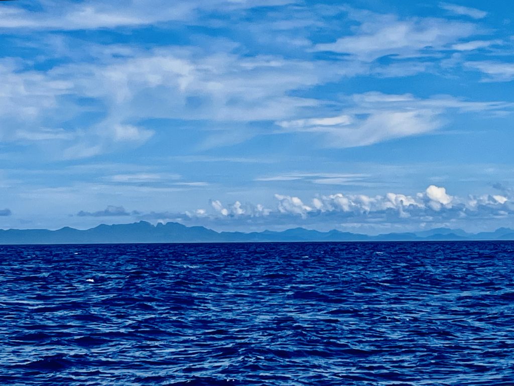 Wir haben den 17.07., 7:17 Uhr und sind wieder on Tour, nachdem wir einen mit Schlick bepackten Anker gehoben und Kette sowie Anker abgespült und gereinigt haben. Die See ist ruppig. Doch nach der ersten Biege wird das Segeln angenehmer, Wind und Welle kommen mehr und mehr von hinten. Wir segeln an der zweiten großen Insel Samoas vorbei. Dort müssen wir gut auf die mehrfach täglich verkehrende Fähre achten, die zwischen den beiden Inseln hin und her saust. Dann bestaunen wir noch die küstennahen Blow Holes, durch die das Wasser wie Fontänen spritzt, dass Klaus schon denkt, da schwimmen Wale 🐳. Dann passieren wir noch ein paar kleinere, unbewohnte Inselchen. Leider dreht der Wind, die Wellen kommen wieder seitlich, voll nervige, kleine Schwibbel-Schwabbelwellen kommen noch dazu. Wir werden wieder ordentlich durchgeschüttelt. Ich hasse das mittlerweile! Hab einfach keine Lust mehr darauf! Ich mag den Pazifik nicht! ☹️ So, das musste mal raus! Dann geht auch noch eine größere Welle seitlich übers Boot und natürlich auch durch Klaus‘ offene Badluke ins Innere. Schön! 😣 Salzwasser im Bad und seinen Badutensilien. Das Fenster stand offen, da der Wassermacher fleißig seinen Dienst tut und es dabei so heiß in dem kleinen Raum wird. Das mag der Wassermacher nicht so gerne. Nun muss er aber schwitzen!