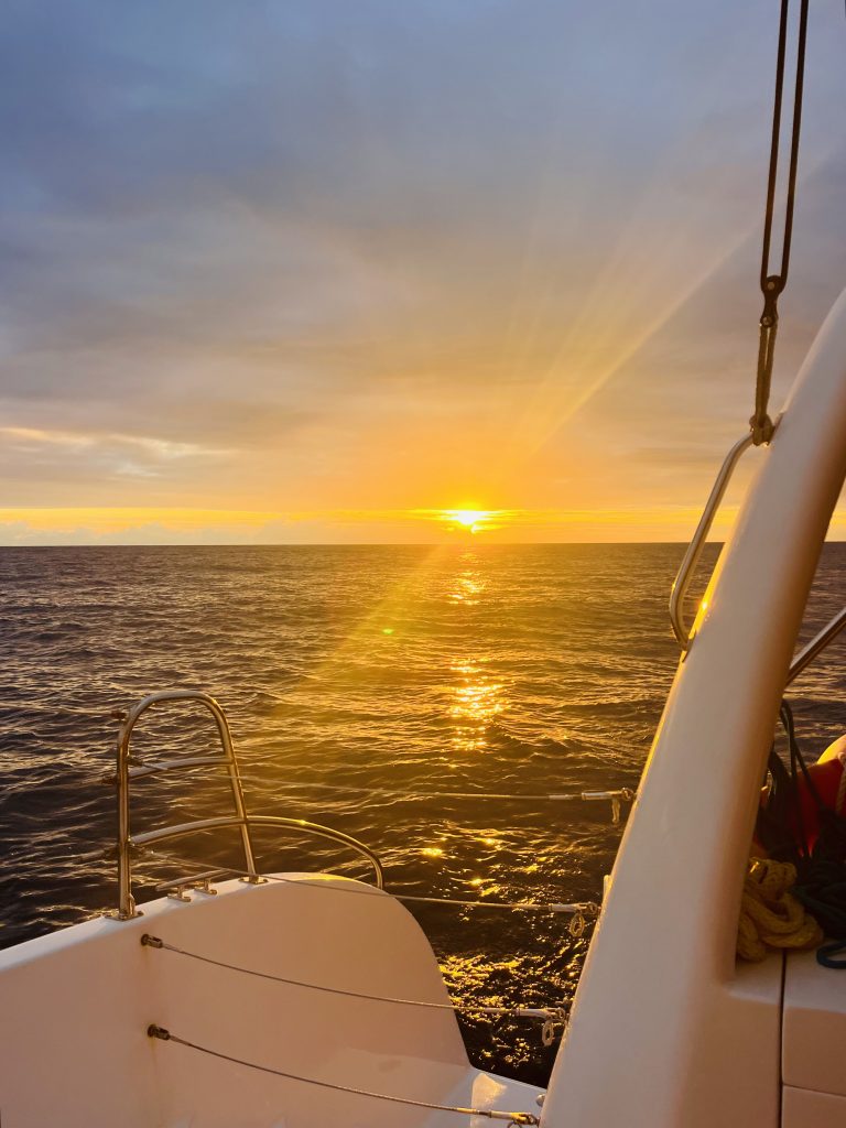 Während ich schlief, in der 2. Hälfte der Nacht, hatte Klaus das Screecher alleine rausgeholt, den Motor wieder ausgeschaltet. Jetzt heißt es Land in Sicht, bei Sonnenaufgang.