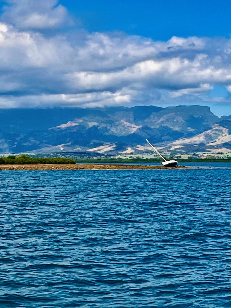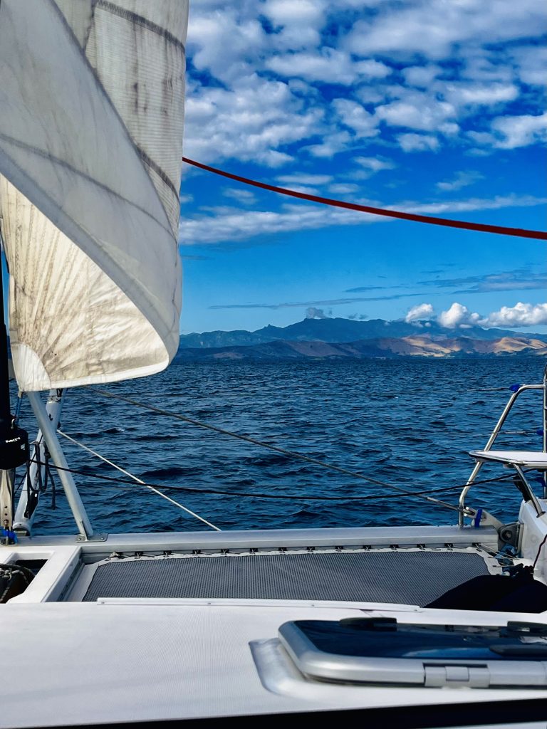 Trotzdem holen wir das Screecher rein, das Jib raus und schalten einen Motor noch dazu. So kommen wir auch auf gute 5 Knoten SOG und unserem Ziel näher. Und der Wind nimmt weiter zu, 27 Knoten haben wir schon. Es wird richtig, richtig unangenehm! Die blöden Wellen kommen in kurzen Abständen seitlich daher, wir werden stark durchgeschüttelt. Dinge fliegen umher, Schrankinhalte klappern und klirren fürchterlich, Yuti ächzt und stöhnt, wir auch!!! Wir müssen uns jeden Schritt genauestens überlegen und auch im Sitzen gut festhalten. Anstrengend‼️ Das sind dann wohl doch noch die „Reste“ der stürmischen Winde um Fidschi. 💨 Später biegen wir links ab, um den Zielort zu erreichen. Dafür müssen wir dann voll ins Gemüse stechen, vorgelagerten Inseln, Untiefen und Riffen ausweichen. Auf mehreren Bildschirmen muss unser Kurs ständig kontrolliert und angepasst werden, dass wir bloß nirgends auflaufen und havarieren. Erschwerend kommt nun Wind und Welle genau von vorne und haut uns direkt auf die Schnauze. Oh ha.. Und genau so geht es auch in die Nacht. Wellen schlagen übers Boot, der Mond ist nur eine Sichel und bringt kaum Licht. Es ist schon gruselig und sauanstrengend! Ich nicker nur hin und wieder für Minuten etwas weg, Klaus gar nicht.