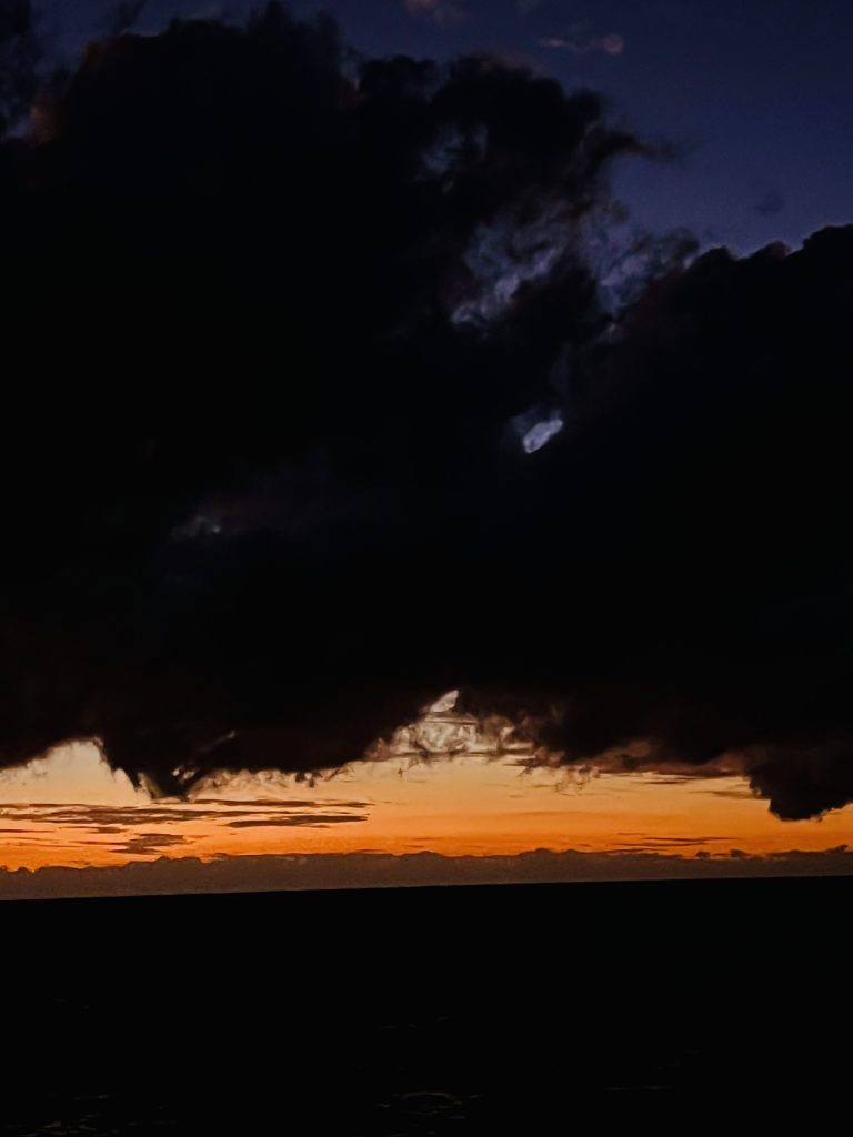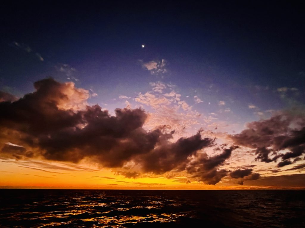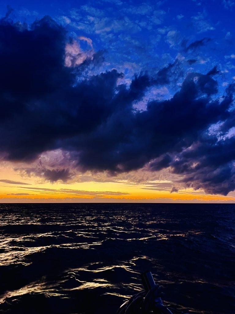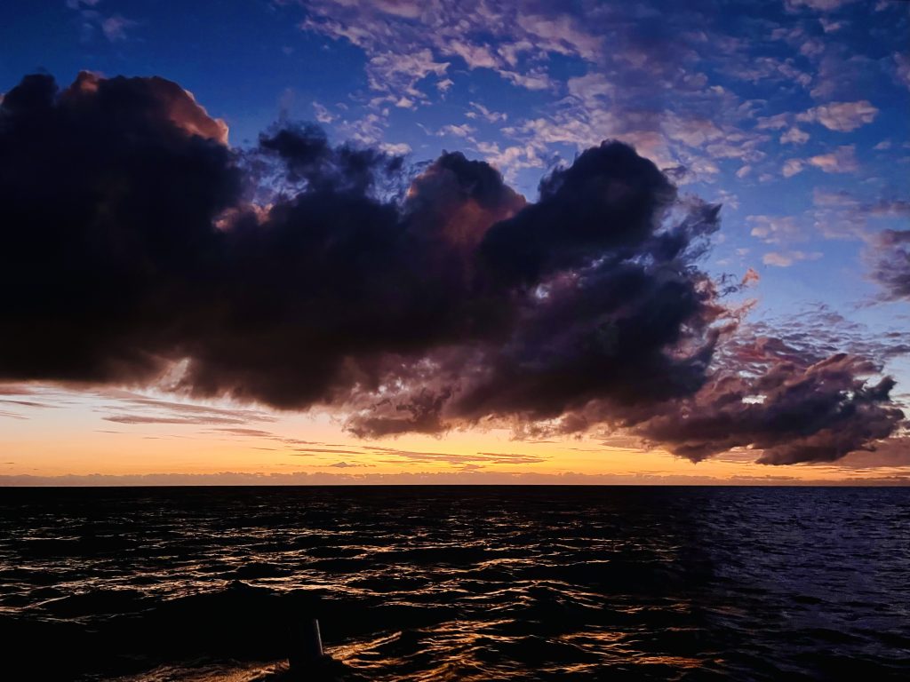 Wir sind mittlerweile an der großen Hauptinsel vorbei, die ist vielleicht lang und segeln nun wieder ins Gemüse. Doch zuvor muss ich die sich mir bietende Wolkenmalerei samt Sonnenuntergang fotografisch festhalten.