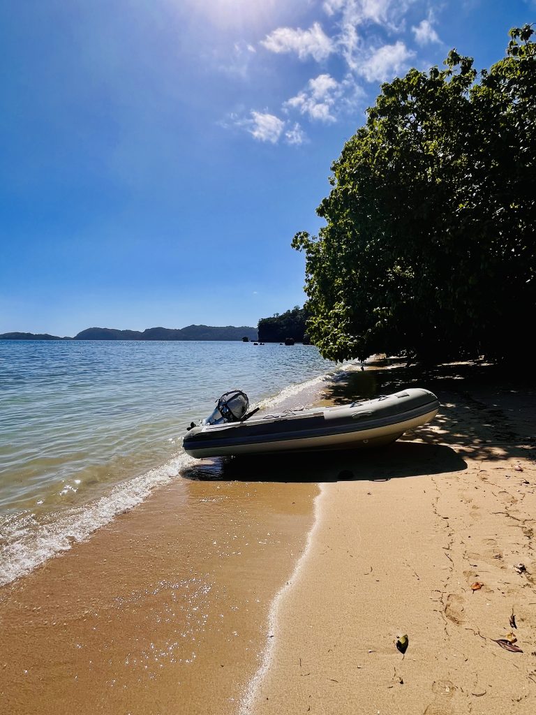 Drei von den 4 anderen Booten sind schon vor uns dort und legen bereits ab, als wir angeschippert kommen. Das passt ja prima! Vor der Insel ist nicht gut ankern, der Untergrund soll überwiegend felsig sein. Deshalb sucht man irgendwo Halt und erledigt möglichst zügig seine Präsentübergabe. 🎁 Dann sucht man sich an anderer Stelle, vorrangig in der Bay of Islands, einen richtigen Ankerplatz für die Nacht.