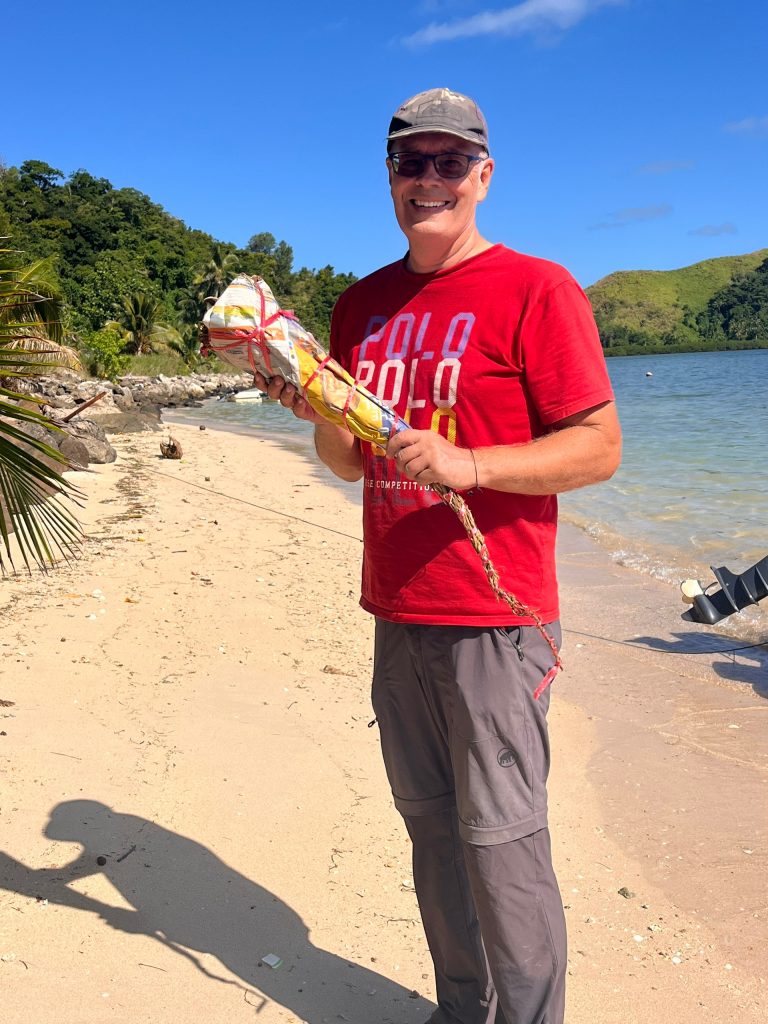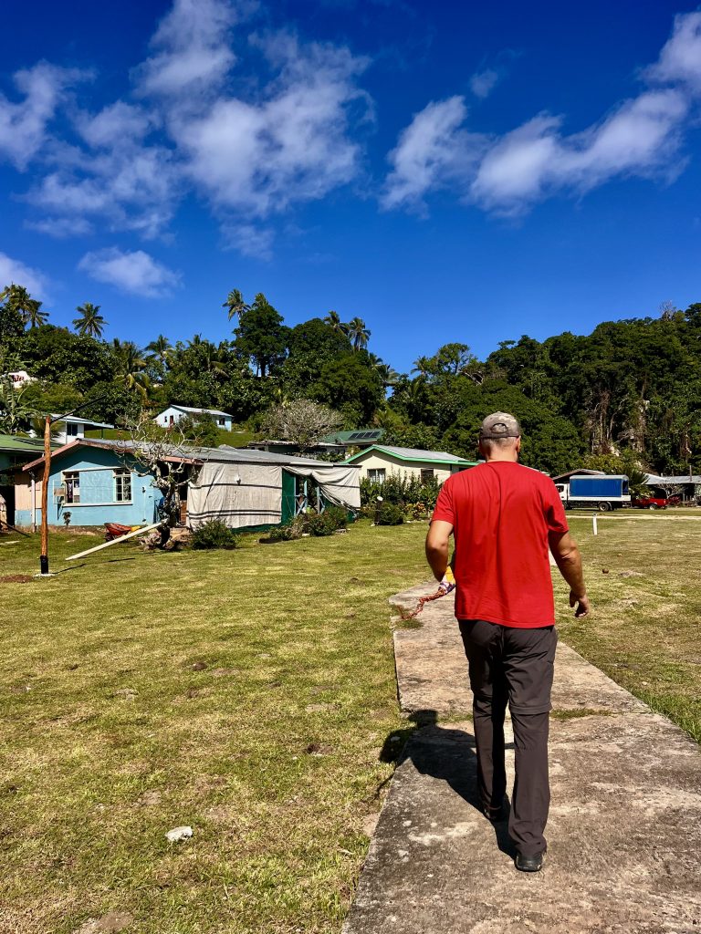 Eben werden wir nochmal zum Platz unter dem Baum gewunken. Ein etwas jüngerer Mann will noch mit uns quatschen. Wer ist denn hier der Captain? Ich zeige auf Klaus. Und wer kocht? Ich zeige auf mich und rolle mit den Augen. Klassische Rollenverteilung… Die Mädchen und Frauen gickern und gackern… Dann will er noch wissen, was wir uns angeschaut haben und ist zufrieden, als ich aufzähle: Straße, Grundschule, Kirche. 👍 Dann will ich mal was wissen. Wo ist die weiterführende Schule? Wo kann man studieren? Da sprudelt er los. Die weiterführende Schule ist im Dorf auf der anderen Inselseite. Zum Studium geht man auf die Hauptinsel und dort in die Hauptstadt Suva, oder nach Neuseeland. Da würden auch viele von ihnen zum Arbeiten hin. Einige kommen zurück, andere blieben dort, manche pendeln. Er selber sei bis nach Australien gegangen, dann aber schnell wieder zurückgekehrt. Ist er hier geboren? Ja, das sei er. Und wer renoviert gerade die Kirche? Ach, meint er erfreut, das sind zurückgekommene Ruheständler, die jetzt ihr Geld und ihre Arbeitskraft in das Kirchenprojekt stecken. Nett! Ja, man wäre halt eine große Familie. Das glaube ich gerne, bei nur 1.100 Bewohnern. Auch sein Essen teile man immer gerne. Habe man fertig gekocht, und der Nachbar oder sonst ein Bewohner käme gerade vorbei, sei derjenige sofort zum Mitessen eingeladen. Hmm, wir sind dummerweise erst nach der Mittagszeit hier aufgekreuzt. Und jetzt machen wir die Flatter. Wir müssen noch ein geeignetes Ankerplätzchen finden. „Morthey, morthey.…“