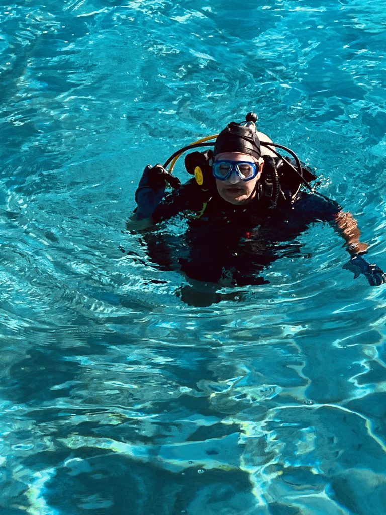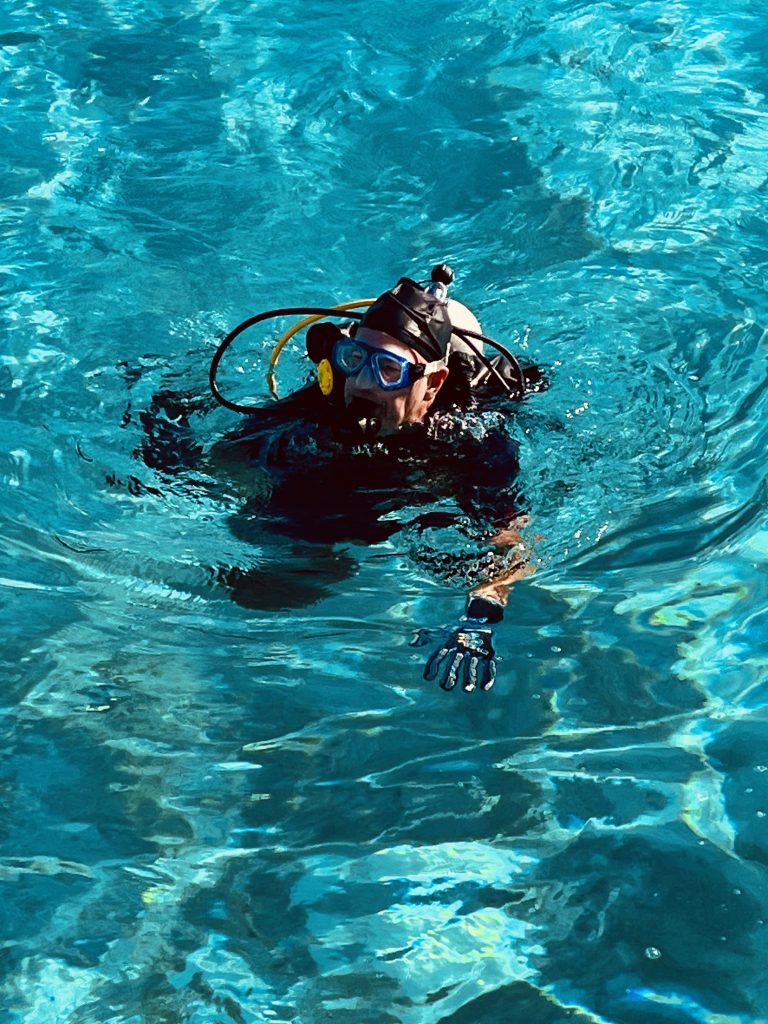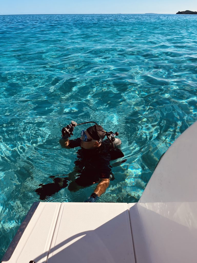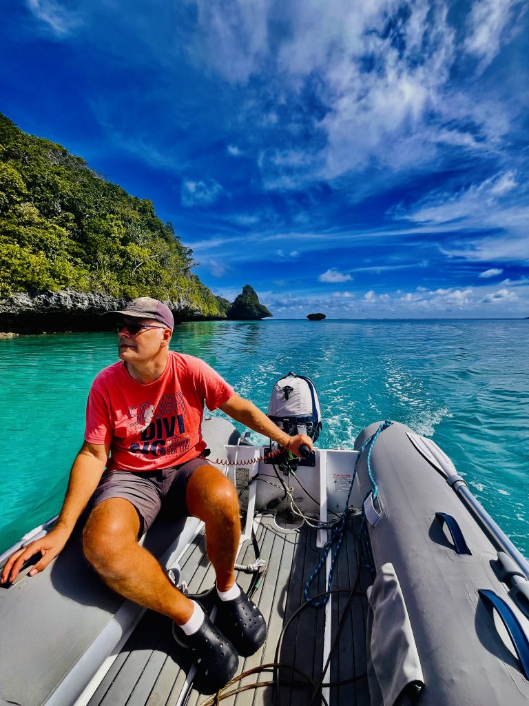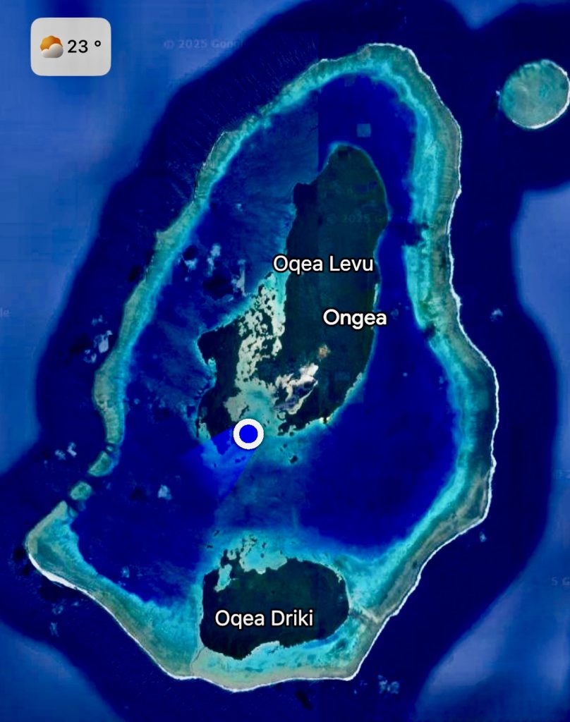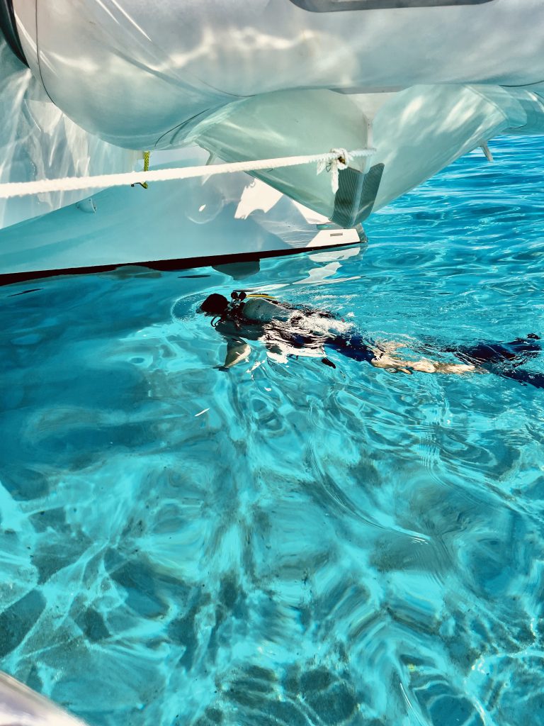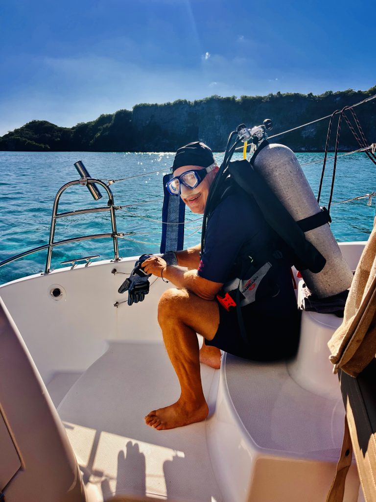 Ja, eigentlich hätten wir uns ja vor allem anderen erst einmal beim Inselchef melden und Sevusevu machen müssen. Aber das Dorf samt Chef ist auf der anderen Insel vom Atoll und schwer zu erreichen. Dazu ist der Chef im Alter von 84 Jahren auch noch kürzlich verstorben. Hmm…, ein neuer ist wohl schon benannt und führt die „Geschäfte“ provisorisch, bis zu seiner Inthronisation im Dezember. Aha. Dennoch wollen wir rübermachen und unserer Pflicht nachkommen. Doch zuvor möchte Klaus nun doch unsere Tauchausrüstung aktivieren und an Saildrives, Propellern und Minikielen die Seepocken entfernen. Ich bin gespannt! Erstmal wird alles kontrolliert, dann die Flasche angeschlossen, das Jacket angezogen, Gewichte eingelegt, Flossen und Taucherbrille angelegt, Badekappe aufgesetzt und mit meiner Unterstützung die Treppe runtergewackelt, der ganze Mut zusammengenommen und ins Wasser gesprungen.