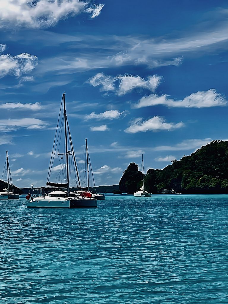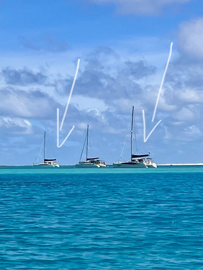 Hier liegen mittlerweile 12 Boote vor Anker, bis auf ein Boot, alles Katamarane.