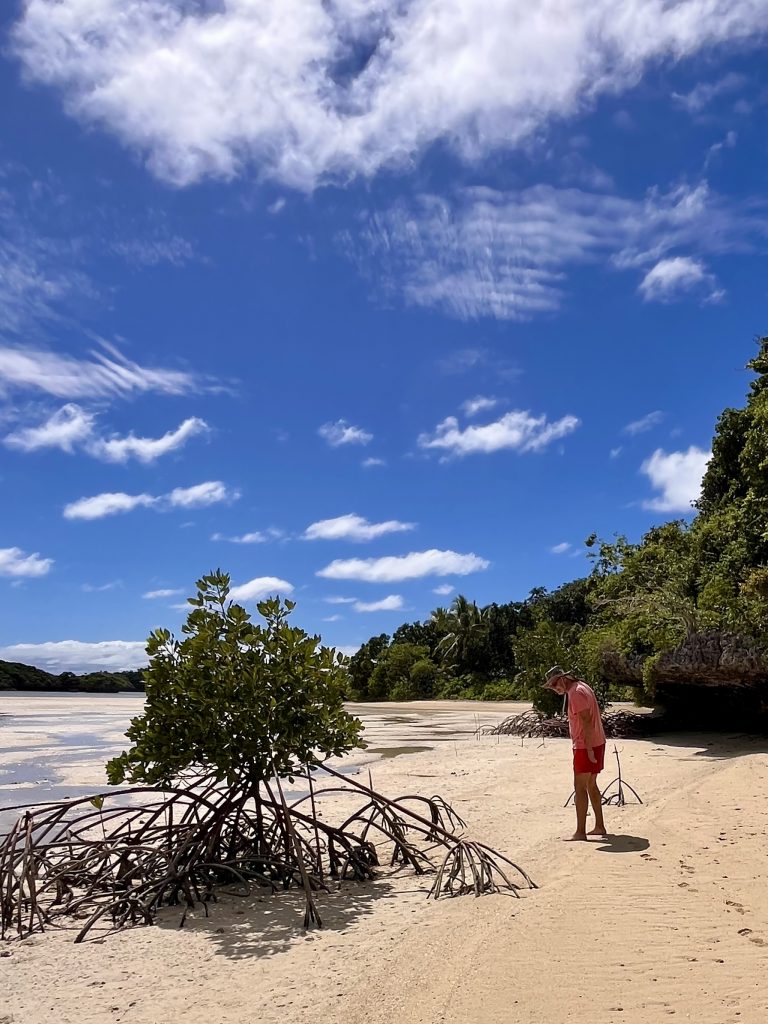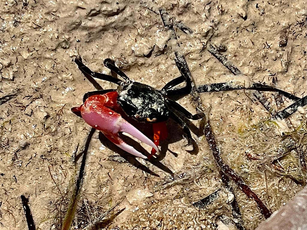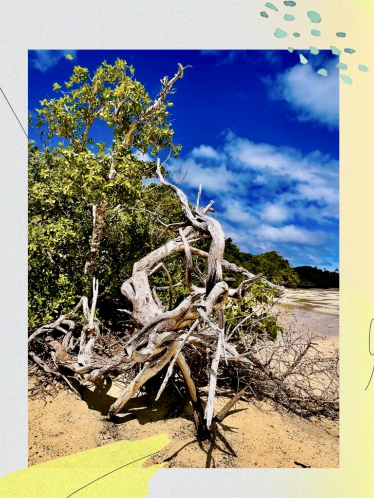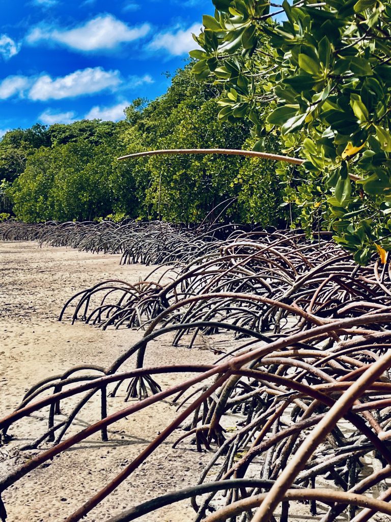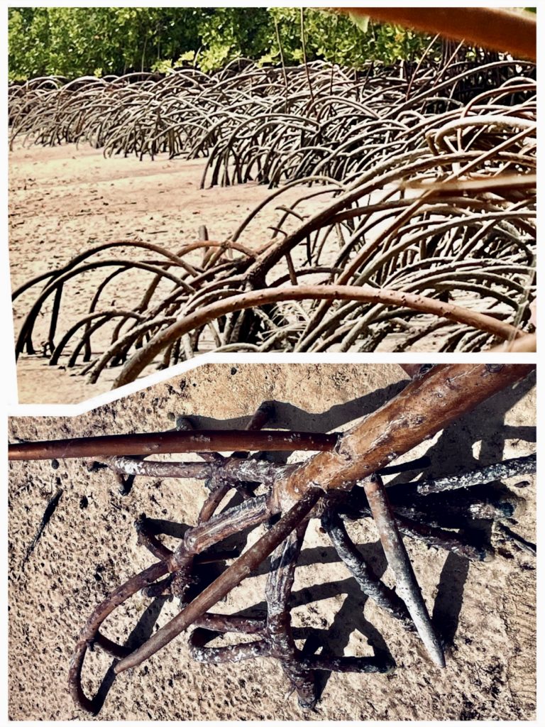Dieses Wurzelwerk sieht schon etwas gespenstisch aus, oder wie von einem fremden Planeten per UFO 🛸 mitgebracht. Tatsächlich sind diese bizarren, gebogenen Luftwurzeln der Mangroven einerseits zum Stützen der Pflanzen im sandigen Untergrund da, andererseits zum Atmen. Sie besitzen Atemporen und Luftkanäle, um die Pflanze im wassergesättigten Boden mit genügend Sauerstoff zu versorgen. Zuviel Salz wird ausgeschieden, oder zum Beispiel in den Blättern gespeichert. Sind deren Speicher voll, werden sie kurzerhand abgeworfen. Auch eine Möglichkeit.