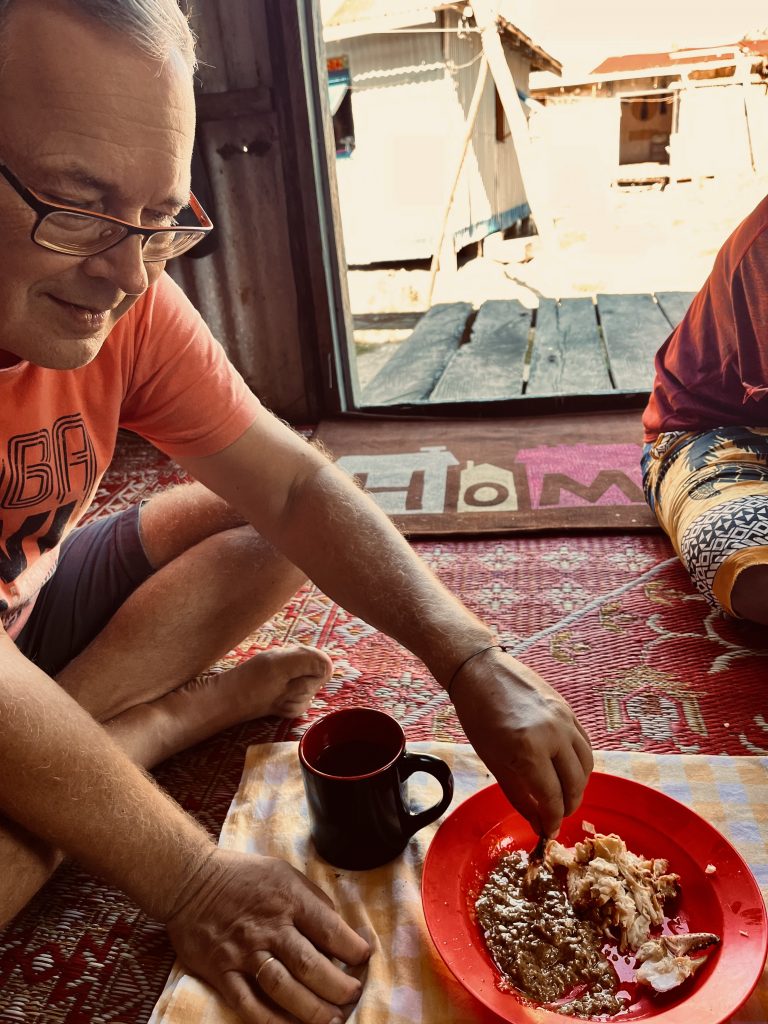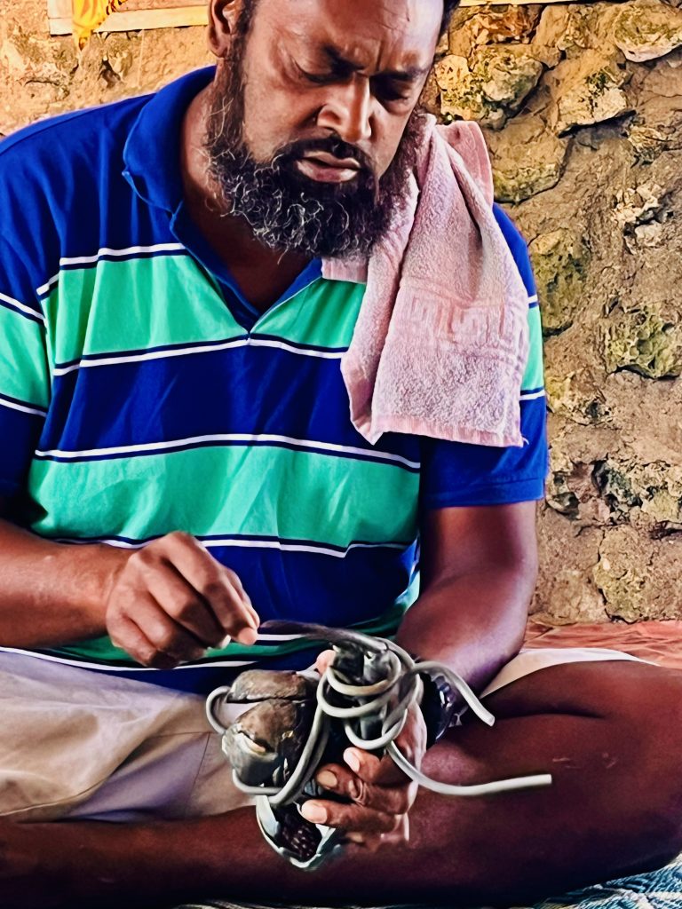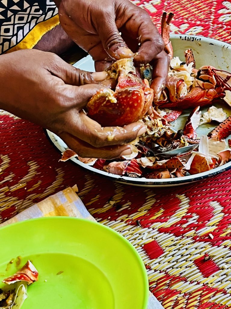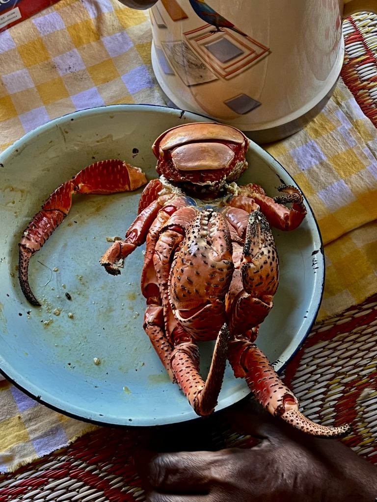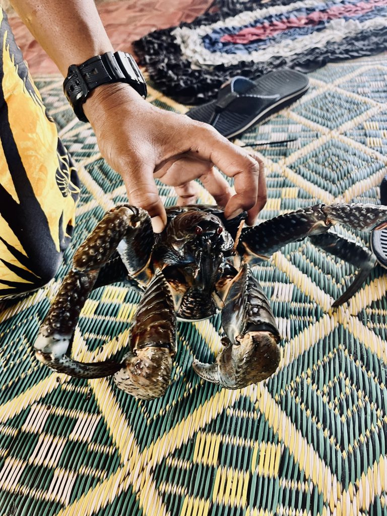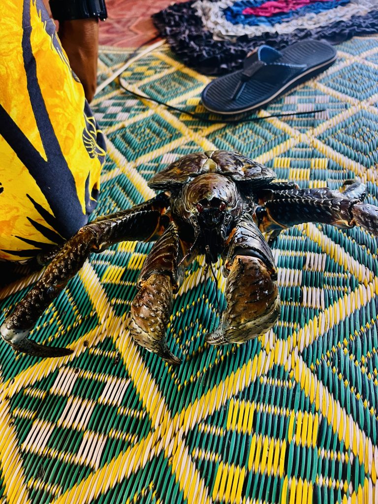 Analyse: Die Einrichtung ist spartanisch und abgenutzt. Es gibt einen Fernseher und ein Handy wird geladen, mit dem Strom, den ihnen die Sonne ermöglicht. Klaus entdeckt noch eine dicke Batterie, die als Speicher dient. Internet haben sie aber nur in der Schule. Das müssen sie dann auch bezahlen. Zwei Fidschidollar für einen Tag und sieben für eine ganze Woche. Rick, ihr Mann, begrüßt uns. Er ist etwas irritiert, was uns betrifft. Schnell erfahren wir von Sarah, dass sie gestern 16 Segler im Haus hatten und alle verköstigt wurden. Mensch, und dann kommen heute auch noch wir. 🤪 Ein Nachbar ist noch mit im Raum, alle sitzen wir im Schneidersitz auf dem Teppich. Zwei Jungs, im Alter von circa 11 Jahren, kommen noch dazu, nicht ihre Kinder. Sie haben ja die 9-jährige Tochter. Wo ist die denn überhaupt? In der Schule. Aha. Die Schule geht bis 15:00 Uhr. Hmmm…., und die 2 Jungs??? Tja, sagt Sarah, die haben Montagsfieber, grins. Ach nee, gibt’s das hier also auch?! Die zwei Schlingel haben montags einfach keine Lust. Der eine, meint Sarah, sei ein ganz Frecher… Wie ist denn hier überhaupt so ein Wochenablauf, frage ich Rick. Na ja, meint er…. Montags hat’s halt das Montagsfieber, grins, Dienstag findet das Dorftreffen statt, wo Dorfangelegenheiten besprochen werden, Mittwoch ist Frauentag, die Männer haben frei, Donnerstag und Freitag macht jeder was er will, Samstag wird das große Essen für Sonntag gesammelt, gefischt und geerntet und vorbereitet, und Sonntag geht’s in die Kirche und dann zum großen, gemeinsamen Essen. Apropos Essen, Sarah geht nun in die Küchenhütte und holt die Kokoskrabbe. Was für ein Tier‼️