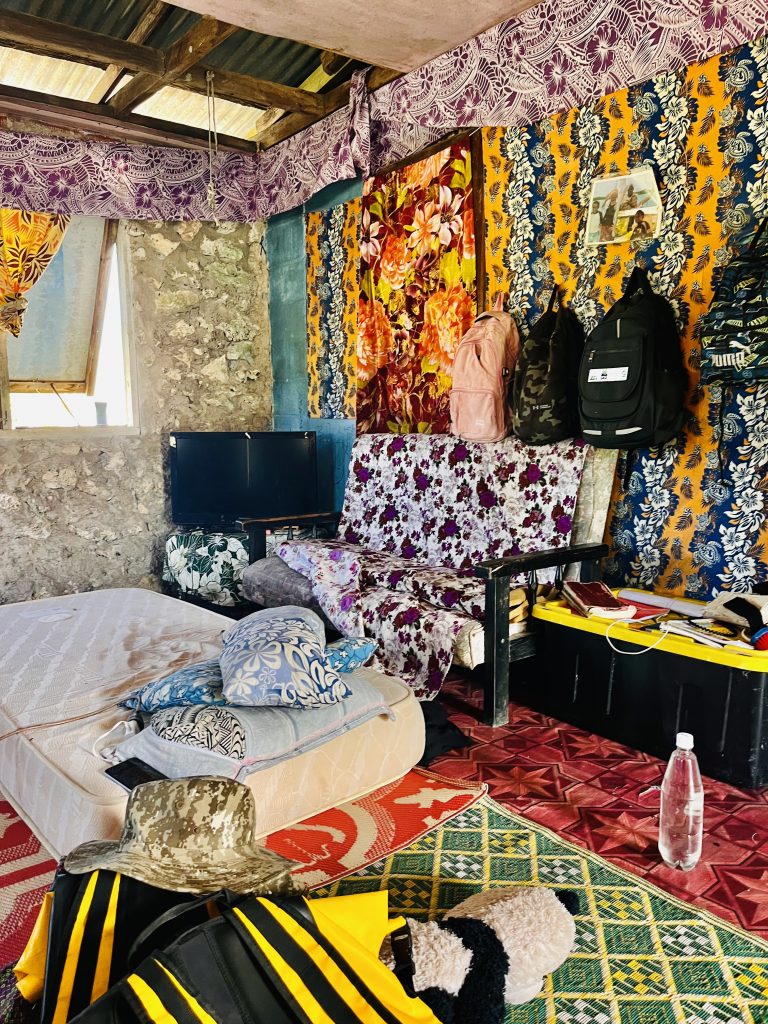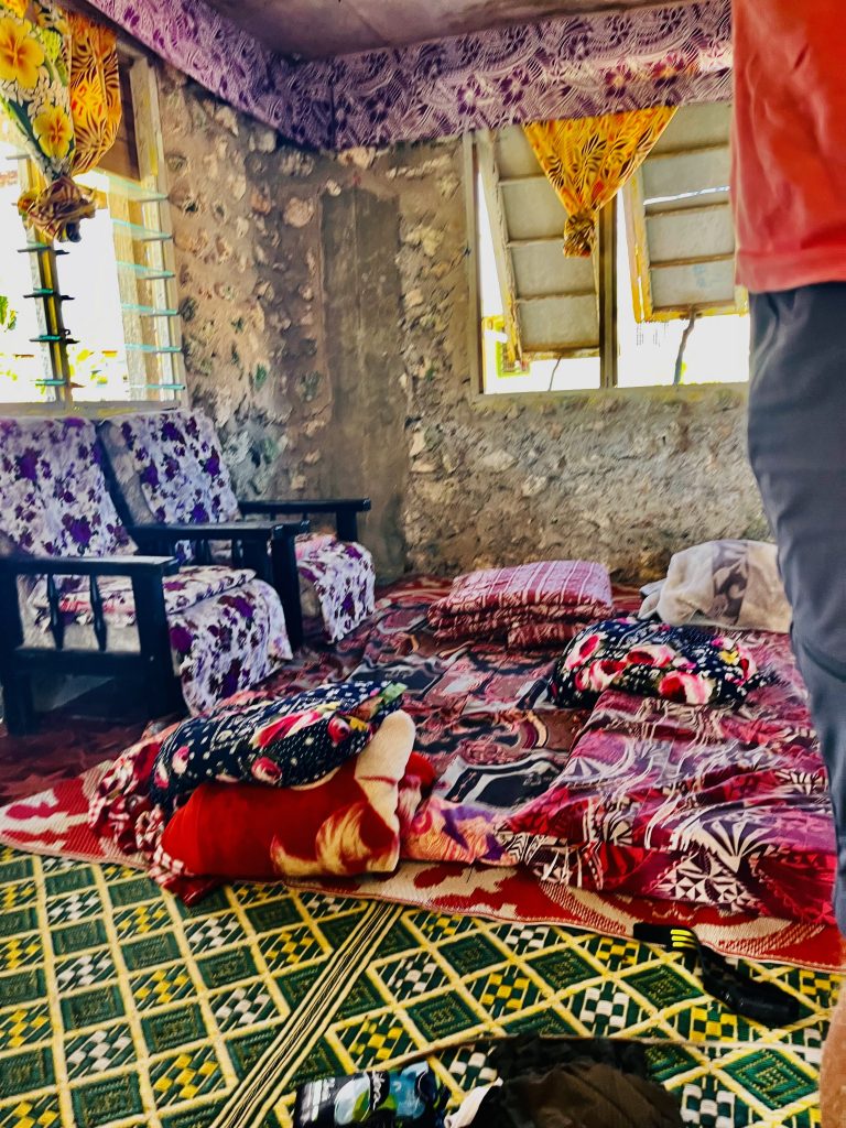 Vom Bauern ist keine Spur, ich runde für eine halbe Staude auf 20,- Fidschidollar auf, sie wird es ihm später geben. Dann möchte sie wissen, ob wir schon mal Kokoskrabben gesehen hätten? Nee, haben wir ja leider noch nicht und gegessen schon gar nicht. Ach, wir sollen mit in ihr Haus kommen, sie zeigt uns eine. Au ja, prima. Sie bewohnt zusammen mit ihrem Mann das einzige Steinhaus. Als ich hineingehe, erschreckt mich die extreme Einfachheit. Verstohlen mache ich schnell 2 Fotos.