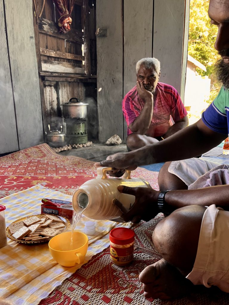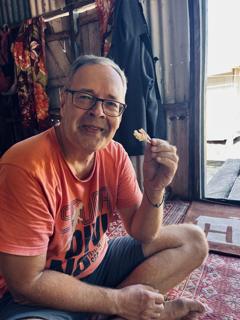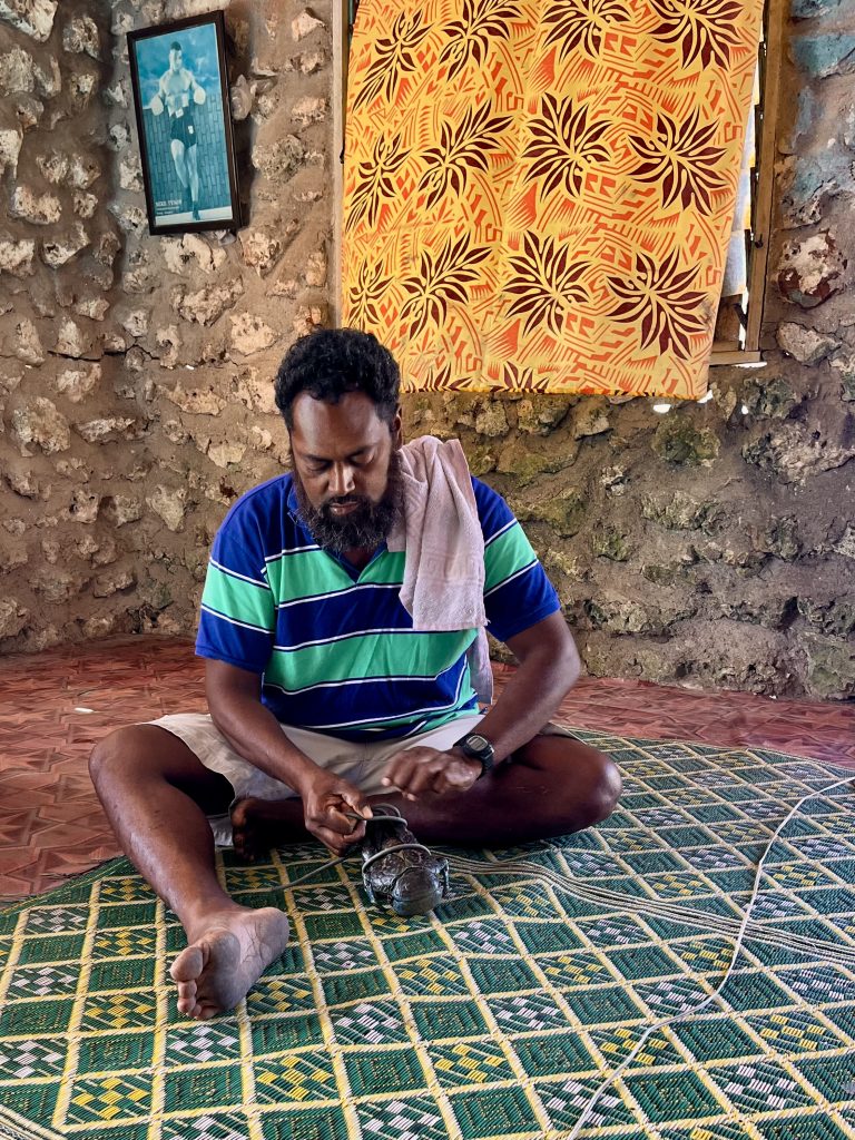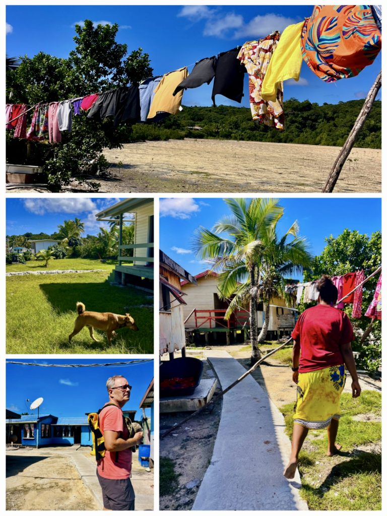 Er knotet und knotet und weist uns auf die Stärke der Greifzange hin. Einen Finger durchtrennt die Krabbe wie Butter. Klar, sie knackt ja auch Kokosnüsse. Dann liegt die Krabbe verknotet auf dem Teppich. Hmmm… 🤔, wann wird sie denn jetzt gekocht? Wir unterhalten uns weiter. Wie ist das hier denn so mit dem Eigentum an Haus und Grund? Ja, dieses Haus gehöre schon ihnen, das Küchenhaus seinen Eltern, das andere Haus auch seinen Eltern. Das dritte dem Nachbarn. Verkaufen dürften sie aber von Staatsseite nicht. Deshalb stehen auch so manche Häuser leer, sie dürfen nicht weitergegeben werden. Also Besitz an Grund und Boden haben sie somit nicht. Sie rauchen immer wieder lange, ganz dünne, selbstgedrehte Zigaretten. Dafür wird ein Stück getrockneter Tabak aus Suva, der Hauptstadt, kleingezupft und in dünnes Papier eingedreht. Sarah’s Gebiss sieht erschreckend aus. Sie ist erst 29 Jahre alt! Ein Schneidezahn fehlt gänzlich, die restlichen Zähne sind gelb, das Zahnfleisch ist deutlich zurückgegangen und entzündet. Ein Kind, ein Zahn? Wie ist das eigentlich mit der ärztlichen Versorgung hier? Eine Krankenstation ist auf einer der nächsten Inseln, ein Krankenhaus erst in Suva, der Hauptstadt. Eine Verbindung nach Suva ist nur einmal im Monat mit dem Versorger möglich. Zwei Tage ist man dann aber mindestens unterwegs. Deshalb bleibt man bei einer Schwangerschaft auch nur bis zum 6. Monat auf der Insel, dann fährt man für die restlichen 3 Monate mit dem Versorgungsschiff nach Suva. Puhh, kompliziert und kostspielig, denke ich mir. Wie kommen sie hier bloß zu Geld? Nur durch uns Touristen? Bekommen sie irgendeine staatliche Unterstützung? Ich glaube, ohne familiäre Kontakte in Suva, ist das hier nicht möglich. Aber ich weiß es nicht. Ich weiß auch nicht, wie das jetzt mit der Krabbe weitergehen soll??? Wir sollten aber mal langsam wieder aufbrechen. Ja, wir sollen die Krabbe mitnehmen. Waaas??? Ja, und selber kochen… Neiiin!!! Ich dachte, sie kocht sie hier, mit uns zusammen. Ich habe gar keinen ausreichend großen Topf und überhaupt… Sie lacht herzlichst und bietet an, die Krabbe nun doch bei sich zu kochen. Ja, das war dann wohl ein Missverständnis zwischen uns… 😜. Also, die Krabbe wird nochmal neu umwickelt, diesmal mit einer dünneren Schnur, dann gehen wir alle rüber ins „Küchenhaus.“