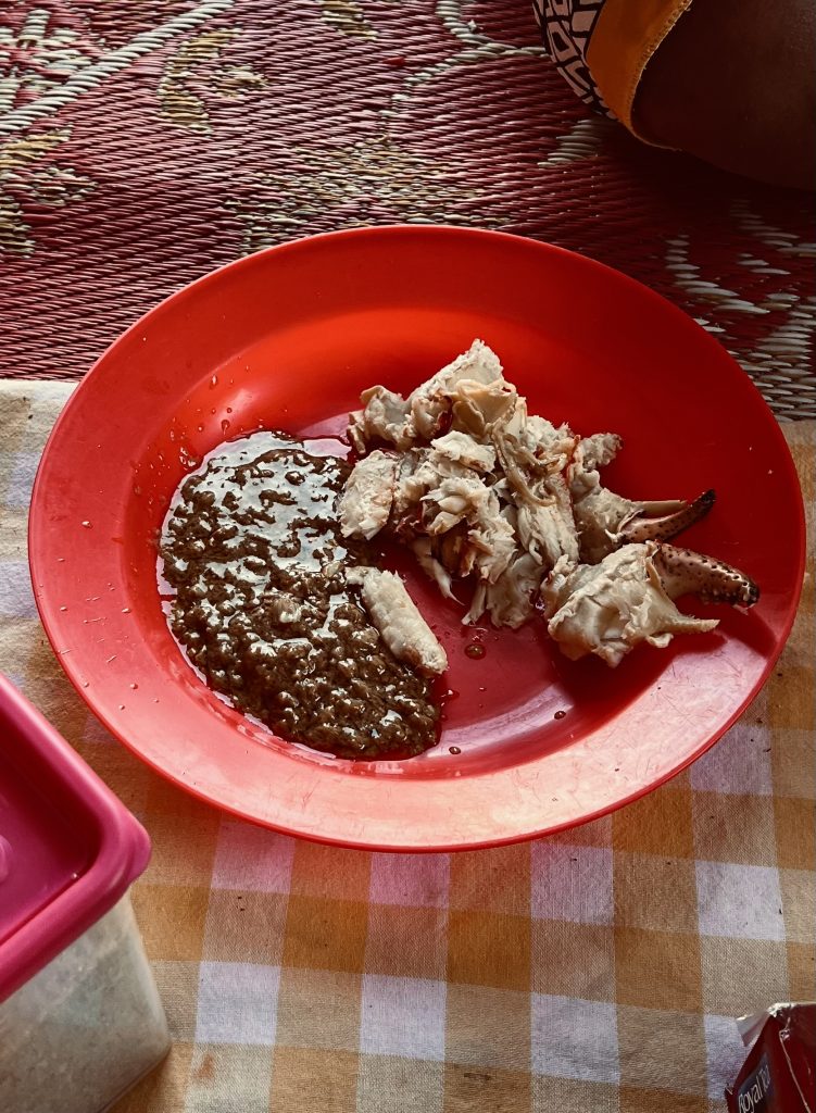 Der Topf dampft, der Tee schmeckt prima, die Erdnusscreme, zusammen mit den Keksen ist echt lecker. Dann ist die Krabbe fertig.