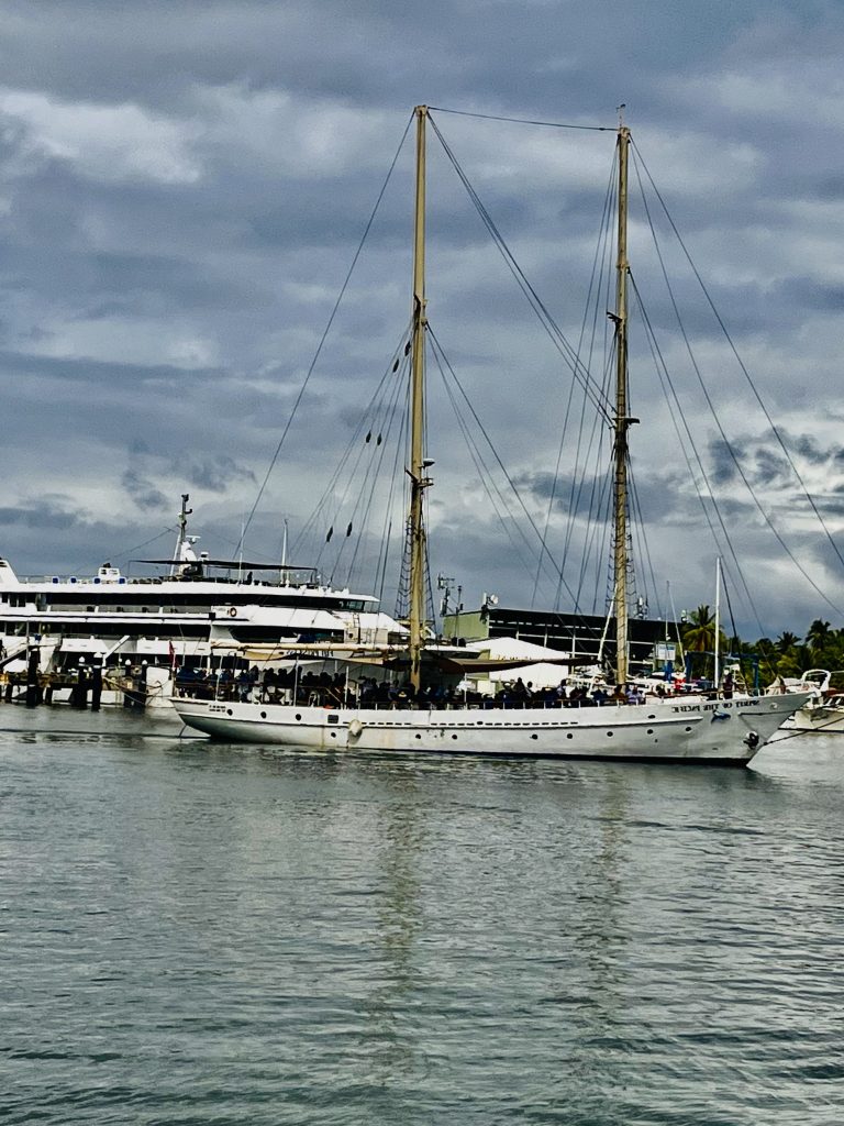 136 zu 83, Ruhepuls 64. Na, das sind doch für einen 61-Jährigen ganz passable Werte. Klaus ist erleichtert und zufrieden. Da klopft es an unserem Boot. Ja, herein… Die Österreicher stehen vor uns. Wir heißen sie herzlich willkommen und zeigen unser Boot. Zu Trinken haben wir aber nur Wasser oder Cola im Angebot. Da schickt Georg seinen “Jockel” aus, um die letzte Tahiti Rumpulle holen zu lassen. Dominique ist blitzeschnell wieder mit Pulle und Zitronen zurück. Na denn Prost❕ Cola-Rum auf Antibiotikum, wenn das nichts ist… 🤨. Wir haben aber eine durchaus nette und lebhafte Unterhaltung. Georg ist Skipper von Beruf, sein 18-jähriger Sohn folgt den väterlichen Fußstapfen. Er ist der jüngste Skipper, der schon unter Vertrag steht und bereits viele 10.000 Meilen auf seinem Konto hat. Sauber! Georg ist nur Teilhaber der 10 Jahre alten Catana, soll sich aber um deren Verkauf kümmern. Ein australischer Interessent ist heute Abend noch im Anmarsch. Dann bekommt er nochmal die Bude voll, 3 österreichische Paare haben für teuer Geld, 3 Wochen bei ihm gebucht. Danach ist dann mit diesem Boot Schluss, und er ist offen für Neues. Zum Beispiel für die große Seawind 1600. Daher auch das Interesse mal grundsätzlich eine Seawind von innen zu sehen. Dann kommt der Interessent, sie setzen wieder über, und wir gehen schlafen. Apropos schlafen… In der angrenzenden Gastronomie geht die Post ab. Ach ja, es ist ja auch Freitag = Feiertag 🥳. Gut, dass wir so weit es nur geht von dem Geschehen entfernt sind, mit unserer Boje Nummer 1 😆! Aber ab 22:00 Uhr wird deutlich leiser gestellt, und dann ist’s okay. 👍