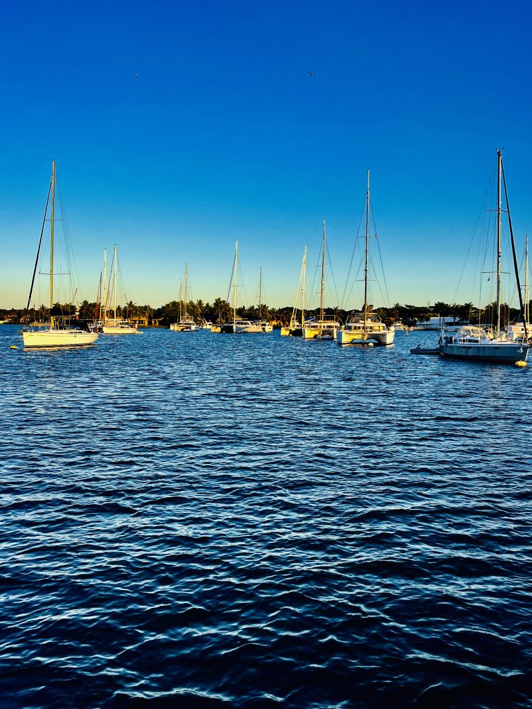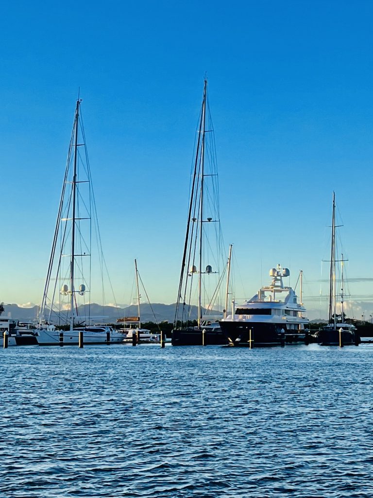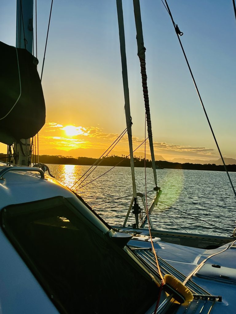 Gerade legen wir die Beine hoch und starten den Fernseher, da ruft‘s zu uns rüber. Georg möchte, dass wir rüberkommen und eine neue Colaflasche mitbringen. Rum und Zitronen hätte er noch da 🤪. Na gut, wir kommen. Das heißt, Dominique holt uns, unser Dinghy ist bereits hochgezogen. Halli Hallo und Prost 🥃. Der australische Kaufinteressent, netter Typ, ist noch an Bord, und es wird laut und lustig gebabbelt. Er organisiert zu Hause Wal-Beobachtungen und Tauchgänge für Touristen und weiht uns in die Gefahren dieses Geschäfts ein. Sehr interessant!! Kein Tauchgang verläuft ohne einen eignen Helikopter in der Luft, der stets und ständig vor Gefahren warnen kann. Ach, vor was denn genau? Tja, vor dem weißen Hai! 🦈 Der weiße Hai, meint er, ist ein fürchterliches Tier! Hochaggressiv, angriffslustig und nicht zu kalkulieren! Er ist eine ständige Gefahr für Leib und Leben. Aha, gut zu wissen! Aber Segelboote greift er doch nicht an, oder? Nein, so ein Verhalten wie die Orca’s vor Gibraltar, zeigen die weißen Haie nicht. Puhhh, ein Glück!