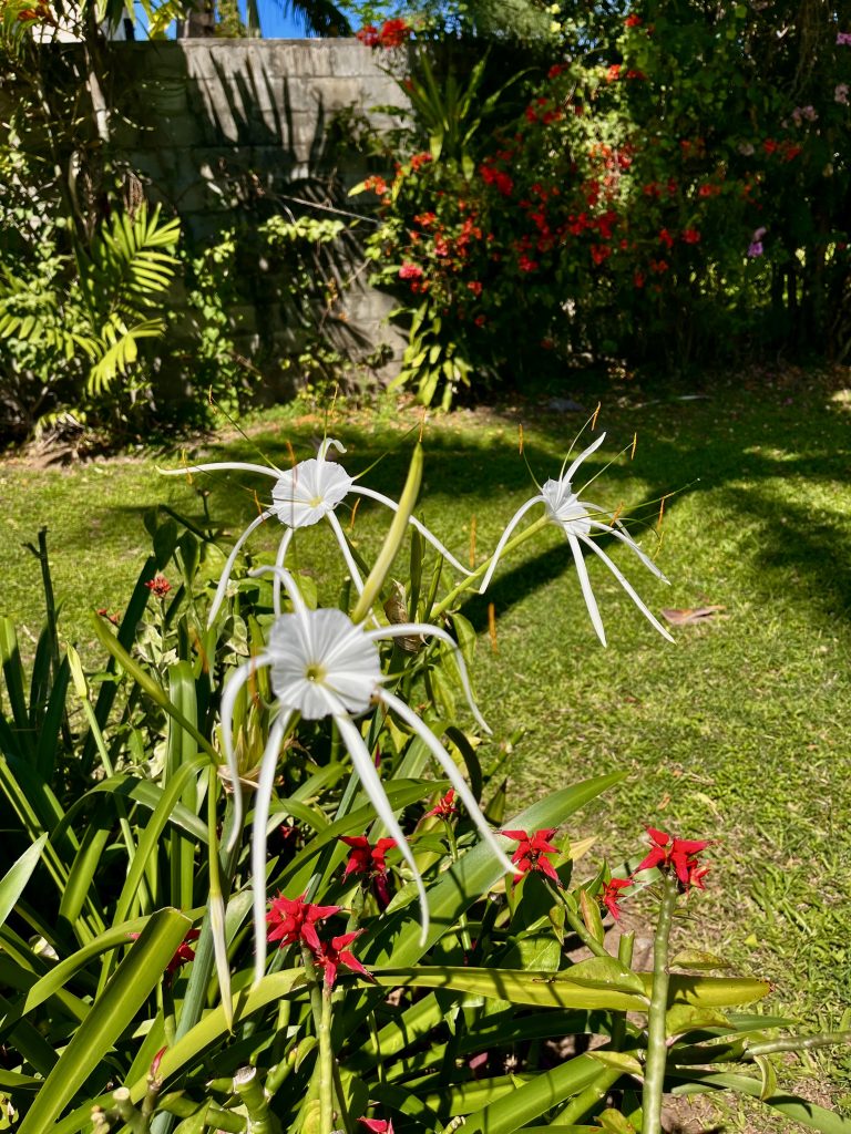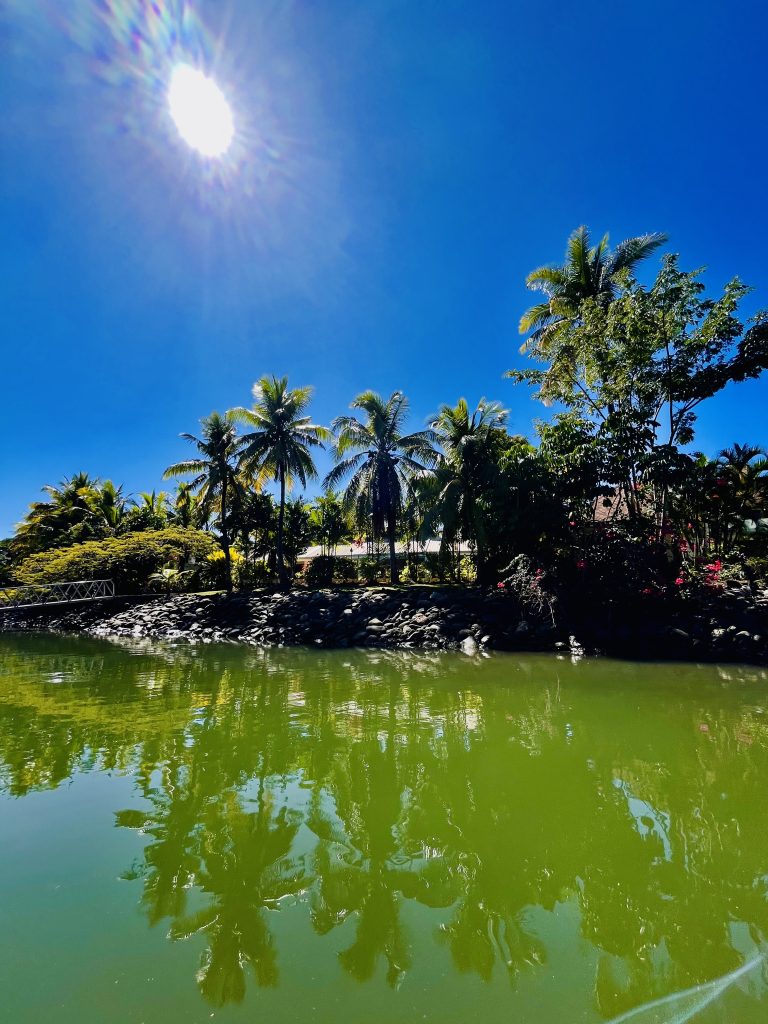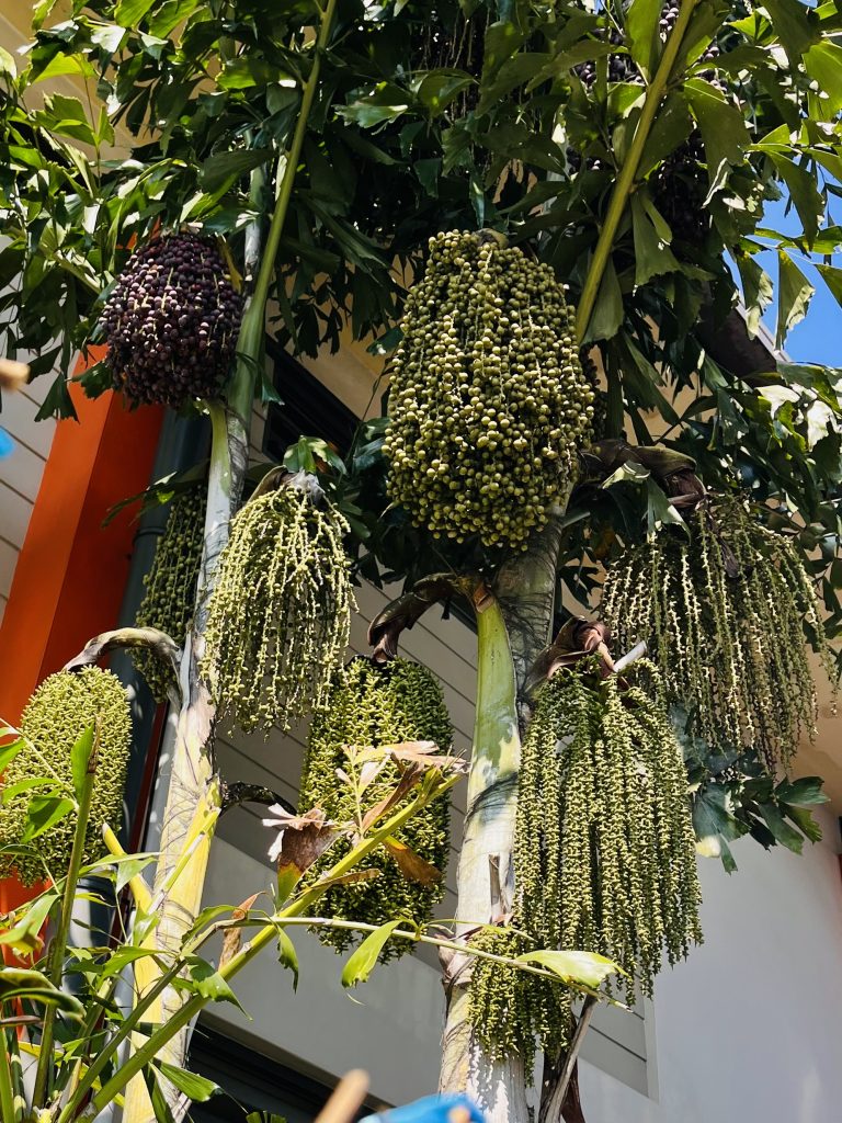 Ach was, wie grün ist hier das Wasser 😳?, und plötzlich hab ich nur noch den moderigen Grund vor Augen und rufe lauthals stopp, Propeller hoch! Wir haben Ebbe und dieser Kanal wird jetzt einfach zu flach. Wir kehren um und zuckeln zum Dinghy Dock. Unsere Gasflasche wird zur Marina gebracht. Dort fotografiere ich schnell noch die unterschiedlichsten Fruchtstände der dortigen Palmen.
